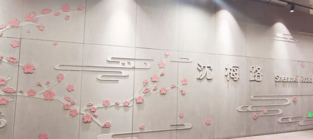 梅开五瓣,象征五福,即快乐、幸福、长寿、顺利与和平。这些美好的寓意,与沈梅路站周边方兴未艾、蒸蒸日上的智慧产业园也算是一种巧妙的契合。