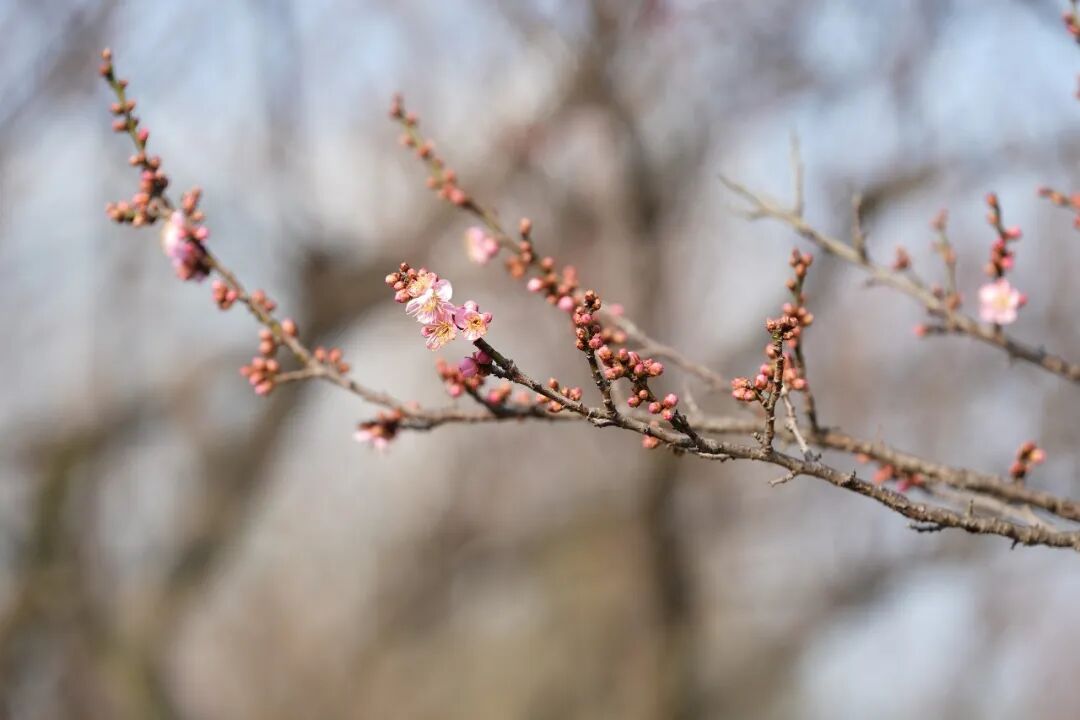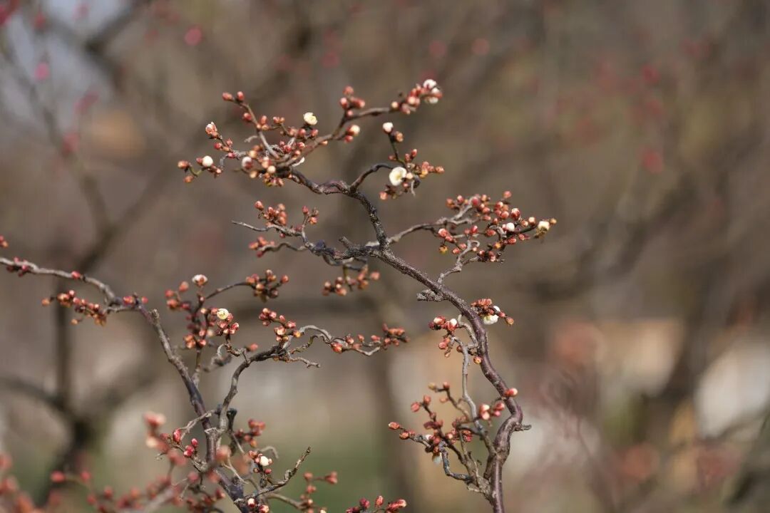 而在梅园,另有一番景致令人惊喜。龙游梅、朱砂梅等早梅品种已零星绽放,浅粉、洁白的花朵点缀枝头,吸引了不少游客驻足观赏。“梅花一般是两月初开,这个时候我觉得开得挺早的。”有游客感慨道。
