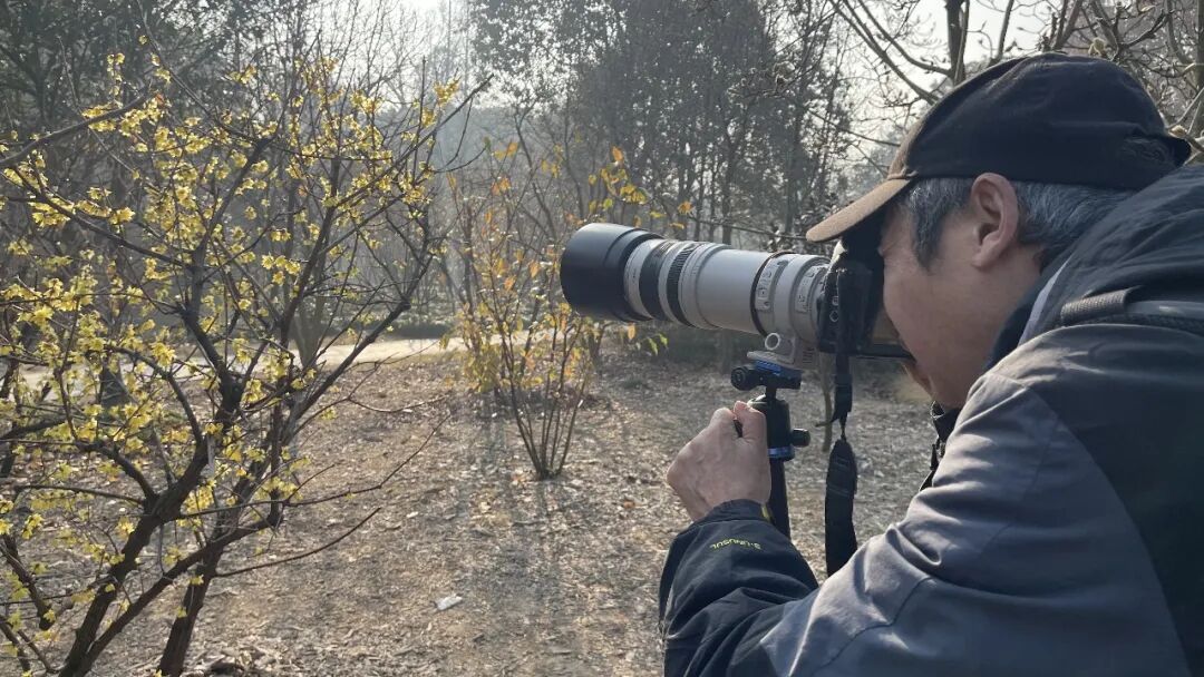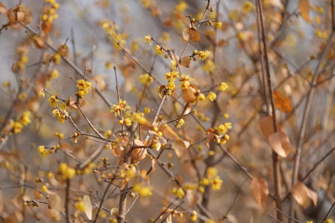 蜡梅花叶同枝的独特景观让摄影爱好者举起相机