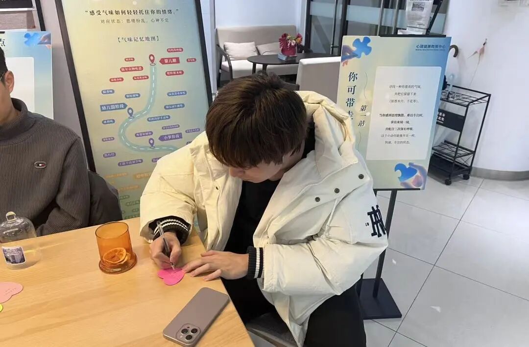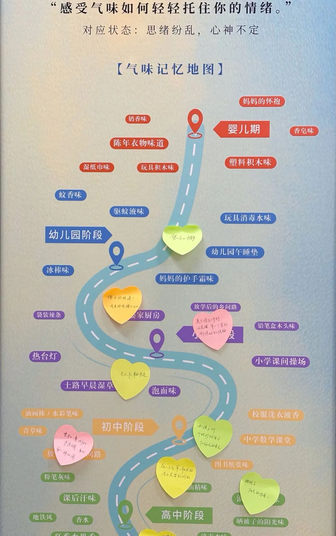 “闻到‘书香墨韵调’的那一刻,我好像突然回到了大一时在图书馆翻开第一本专业书的那个下午。”这瞬间的共鸣,被同学们记录在“气味记忆地图”上——一幅绘有从婴儿期到大学期人生场景的画卷。大家在自己被触动的位置贴上标记,有人留在“小学放学后的乡间路”旁,有人标记在“高中晒被子的阳光味”边。