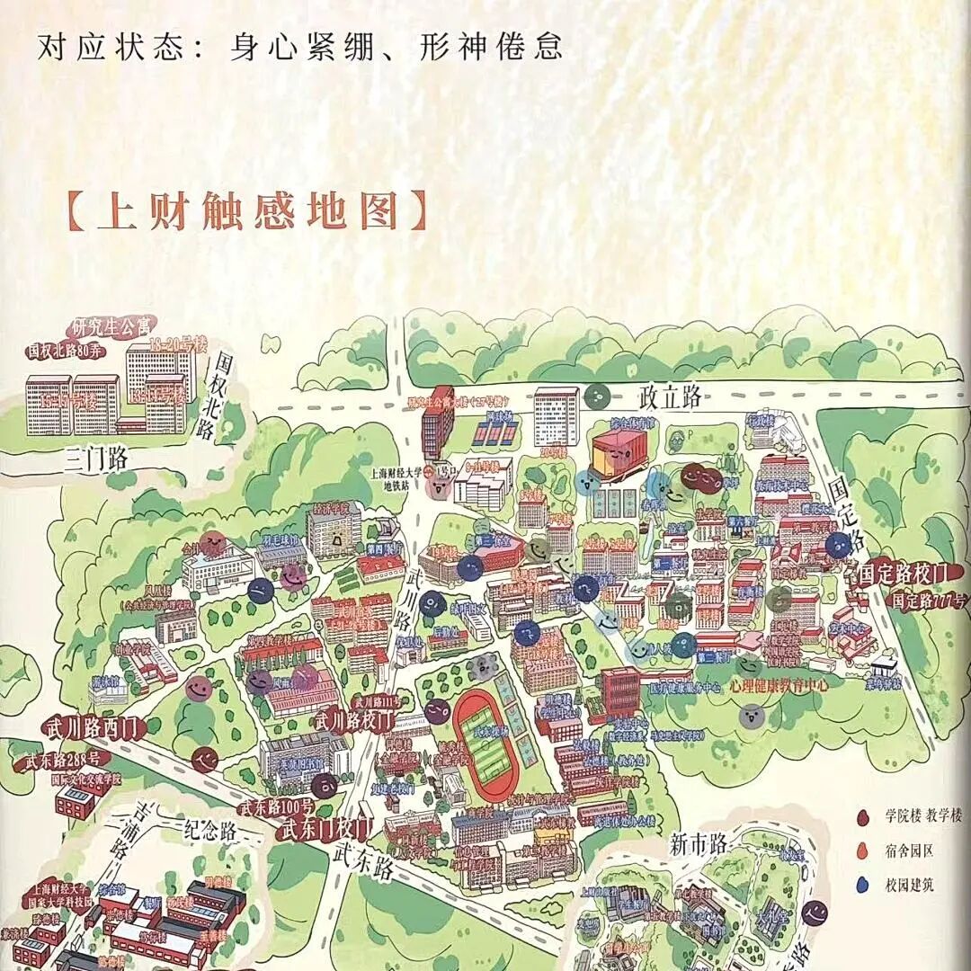 “当摸到那块风化的老树皮时,指尖的粗粝感好像突然连通了武东校区那些深沉的岁月。”这份触感引发的联想,被进一步具象化——同学们在“校园触感地图”上寻找对应的材质区域,贴上一枚圆点贴纸,标记自己与校园的这一次真实相遇,点点痕迹诉说着上财人共同的情感印记。