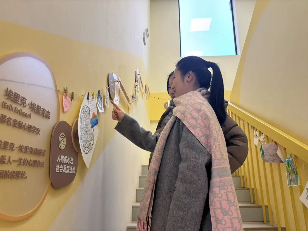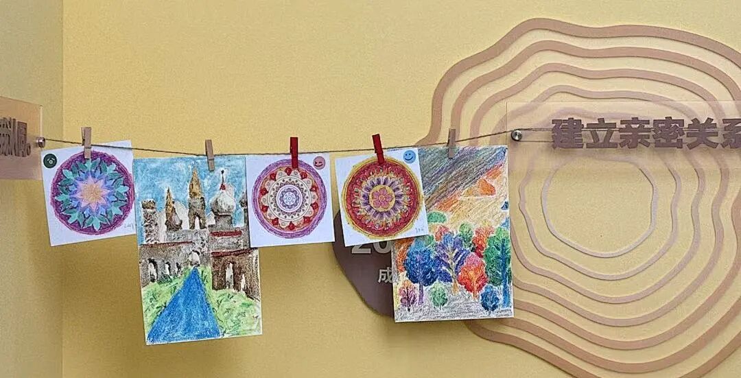 而这份通过涂色收获的专注力,最终也化为可见的风景——同学们把完成的作品夹在心理中心楼道两侧,形成了独特的“曼陀罗廊道”。同学们在上下楼时,总忍不住驻足欣赏这些色彩与形状的交响。