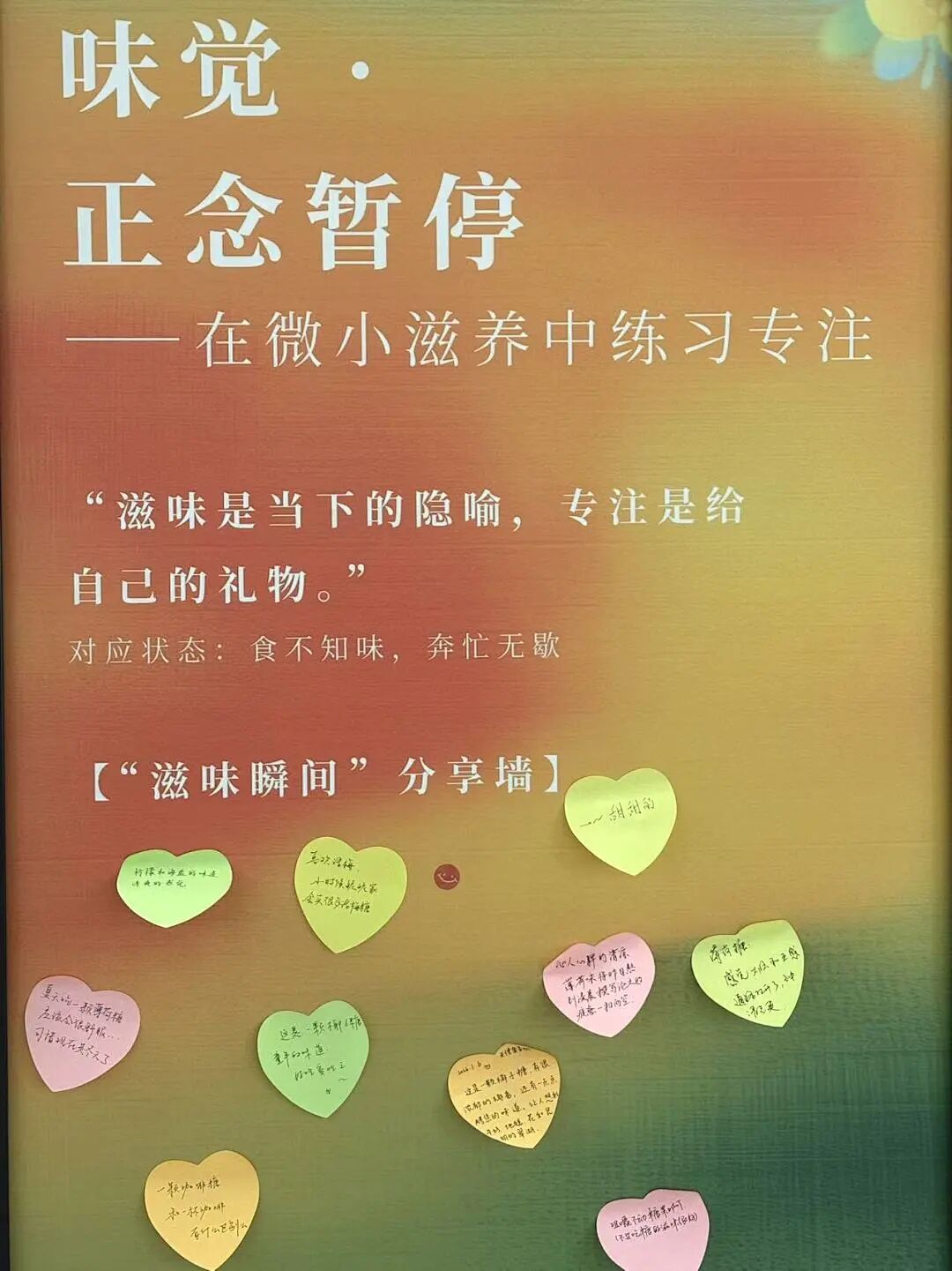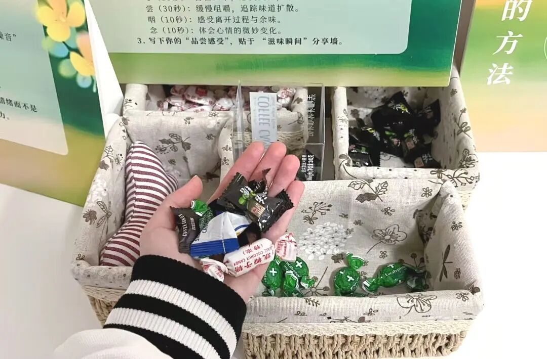 这份微小而真切的感受,被同学们以文字的形式留在了“滋味分享墙”上——“清凉薄荷味将昨日熬到凌晨撰写论文的疲惫一扫而空”“这是一颗椰子糖,童年的味道”“让人联想到牛奶、地毯、花和昆明的翠湖”。一个个简单的句子,提醒着每一个路过的身影:真正的放松,往往就藏在最平凡的感官苏醒里。