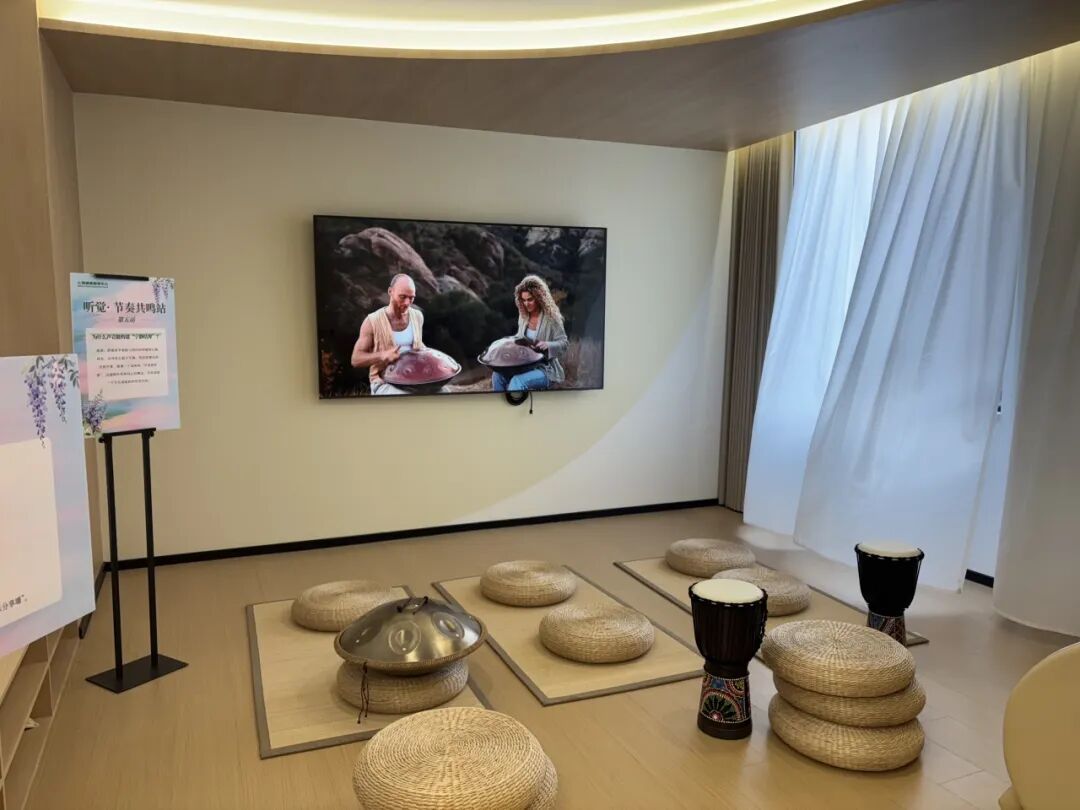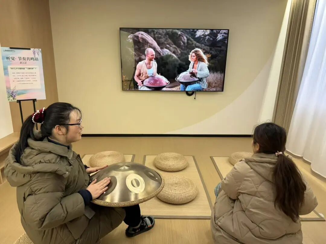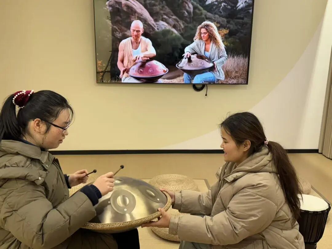 让鼓点带走紧绷,让回响带来宁静。在听觉站点,同学们不仅沉浸在由手碟与非洲鼓编织的天然声场中,感受其频率对生理节律的温和调节,更在视频引导下亲自尝试拍打这些乐器。当身体与节奏同频,紧绷的神经也随之松绑。
