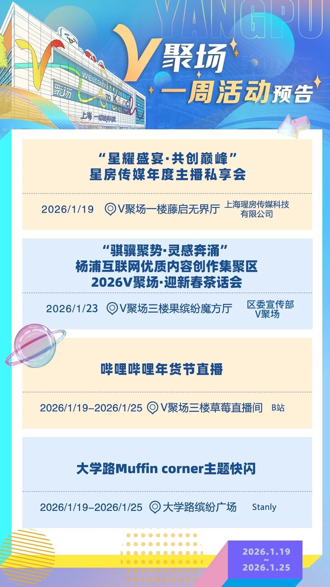 与千万粉丝“UP主”面对面互动,和B站、抖音、小红书等互联网大厂座谈交流,与AI领域创始人探讨人工智能发展新趋势……在杨浦V聚场,随时都有最前沿活动等你来打卡。无论你是互联网从业者,还是创意玩家……这里都将成为你迸发灵感的“能量场”。V聚场1月19日-1月25日一周活动预告来啦!快来碰撞灵感~
