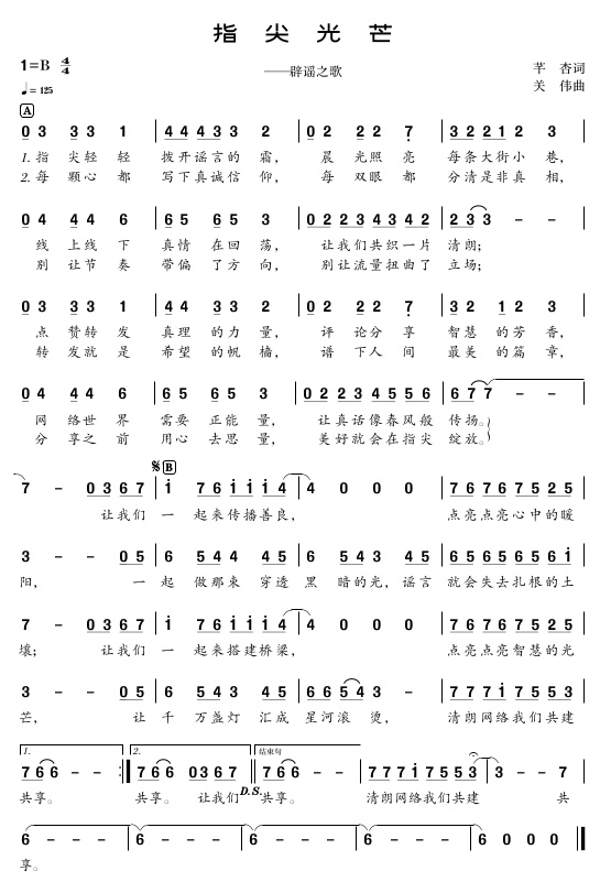 《指尖光芒》由嘉定本土音乐人创作,歌曲由芊杏作词、关伟作曲、鄂莞婷演唱,以明快节奏和真挚歌词,呼吁大家在网络世界中保持清醒、传递善意。