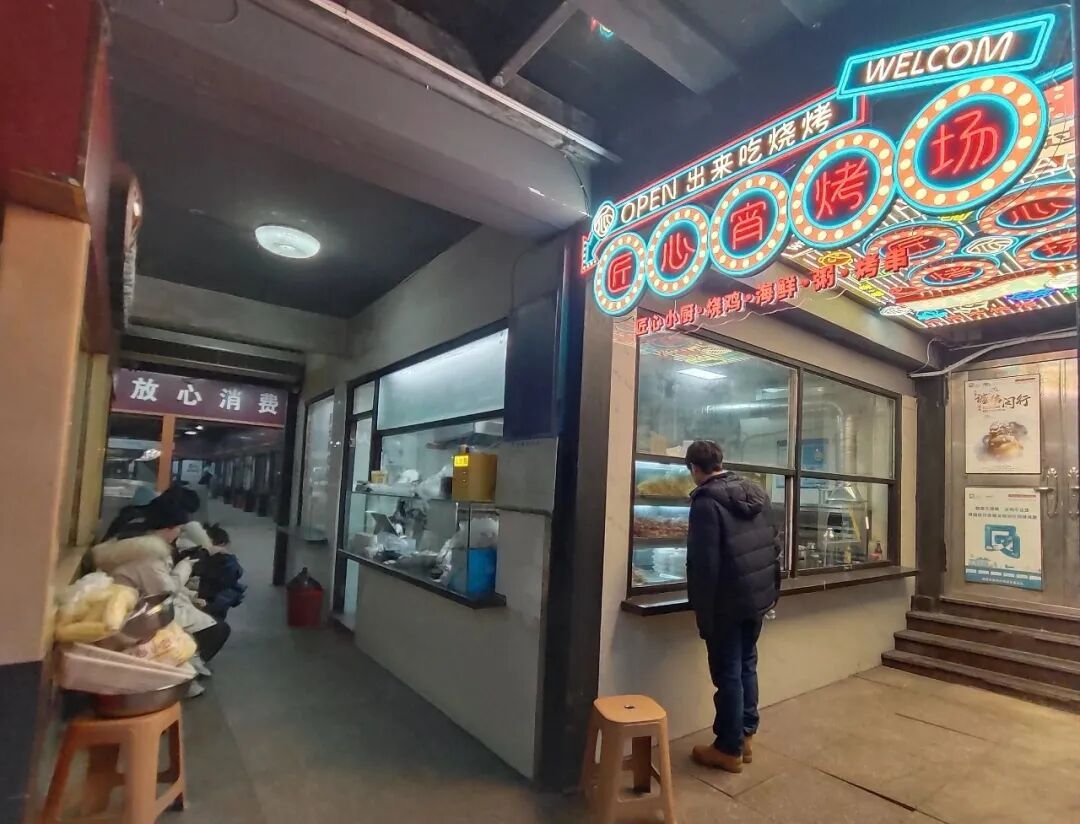 天色渐暗,飘起微雨。“匠心宵烤场”外的过道站满了等待的人。