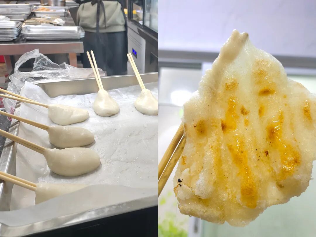 连烤串的顺序也有讲究。火旺时先烤竹蛏,待蒜蓉滴落压住些火气,便轮到掌中宝、鸡颈肉,接着是大肠、鸡翅……当炭火积蓄到最温和的状态,压轴的年糕登场——现蒸现打,烤到外皮微焦酥脆,内里糯软烫口,表面的白糖融化成一层薄薄的糖衣。