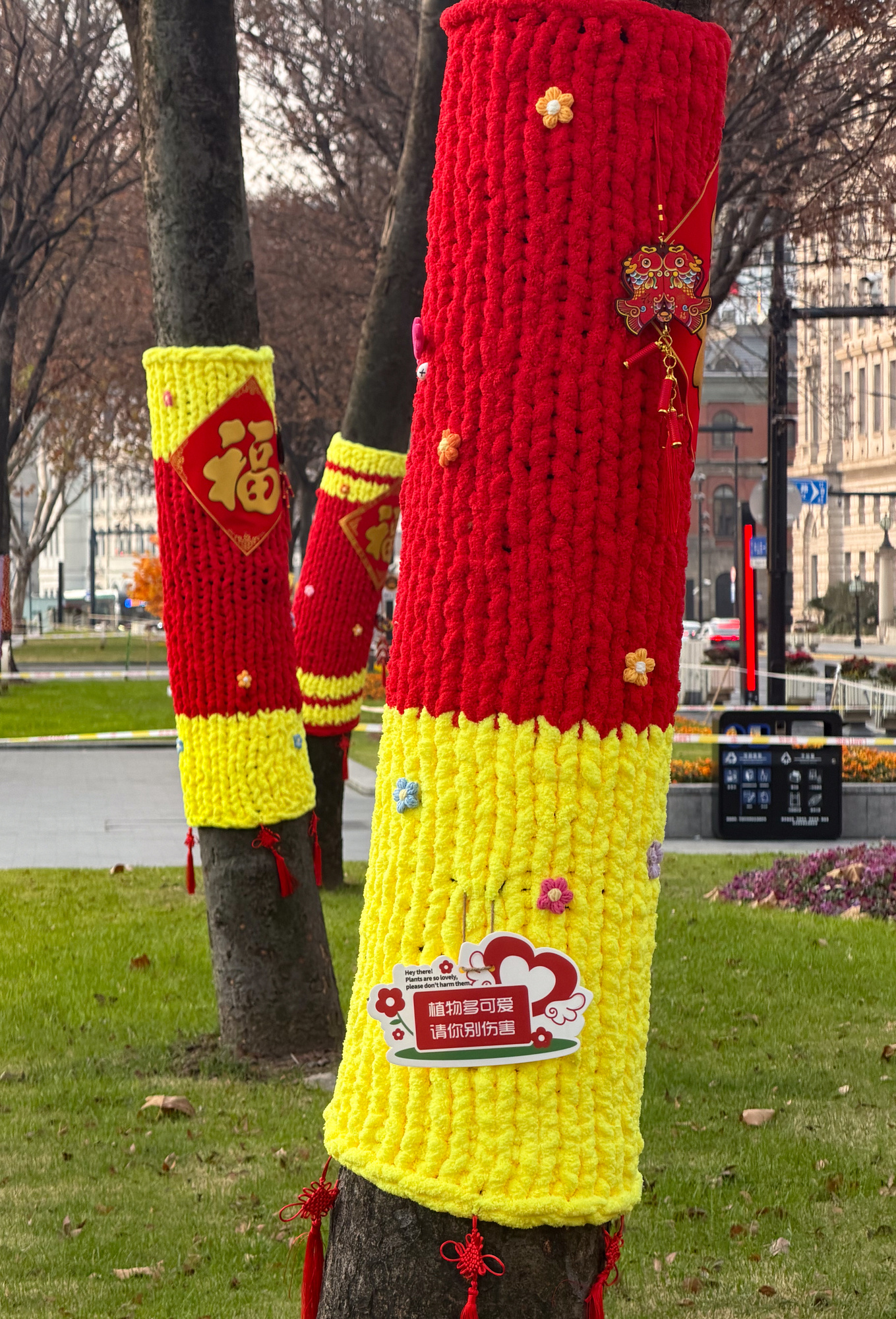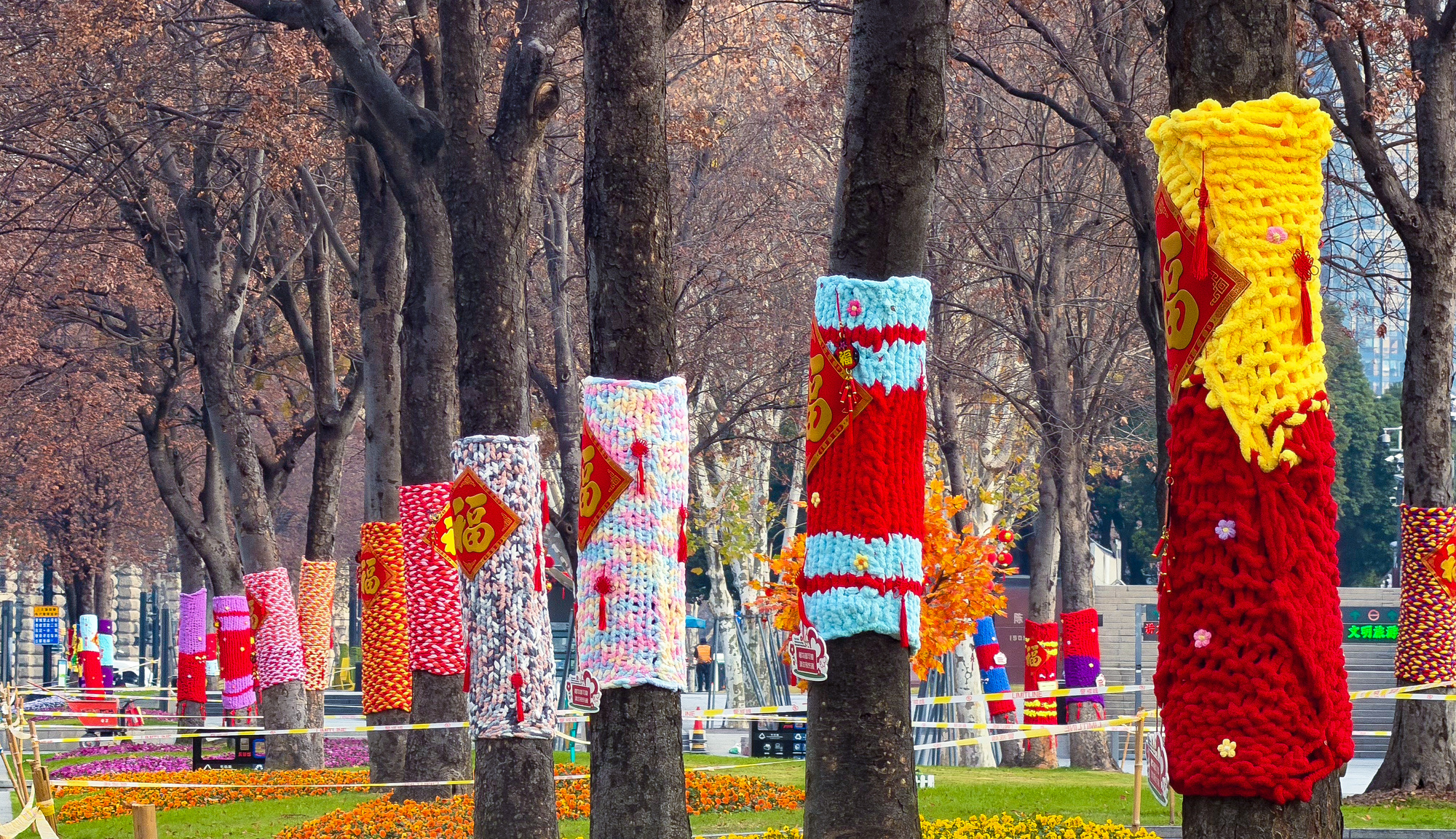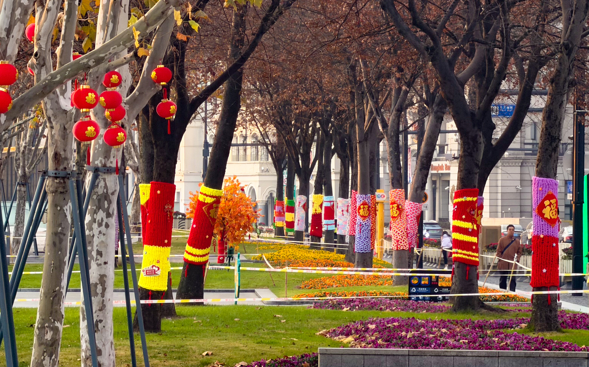 外滩沿线的部分树木被手工织成的彩色毛线织物包裹起来,花纹、福字、红灯笼,为这个冬日增添了一丝年节的温馨气氛。