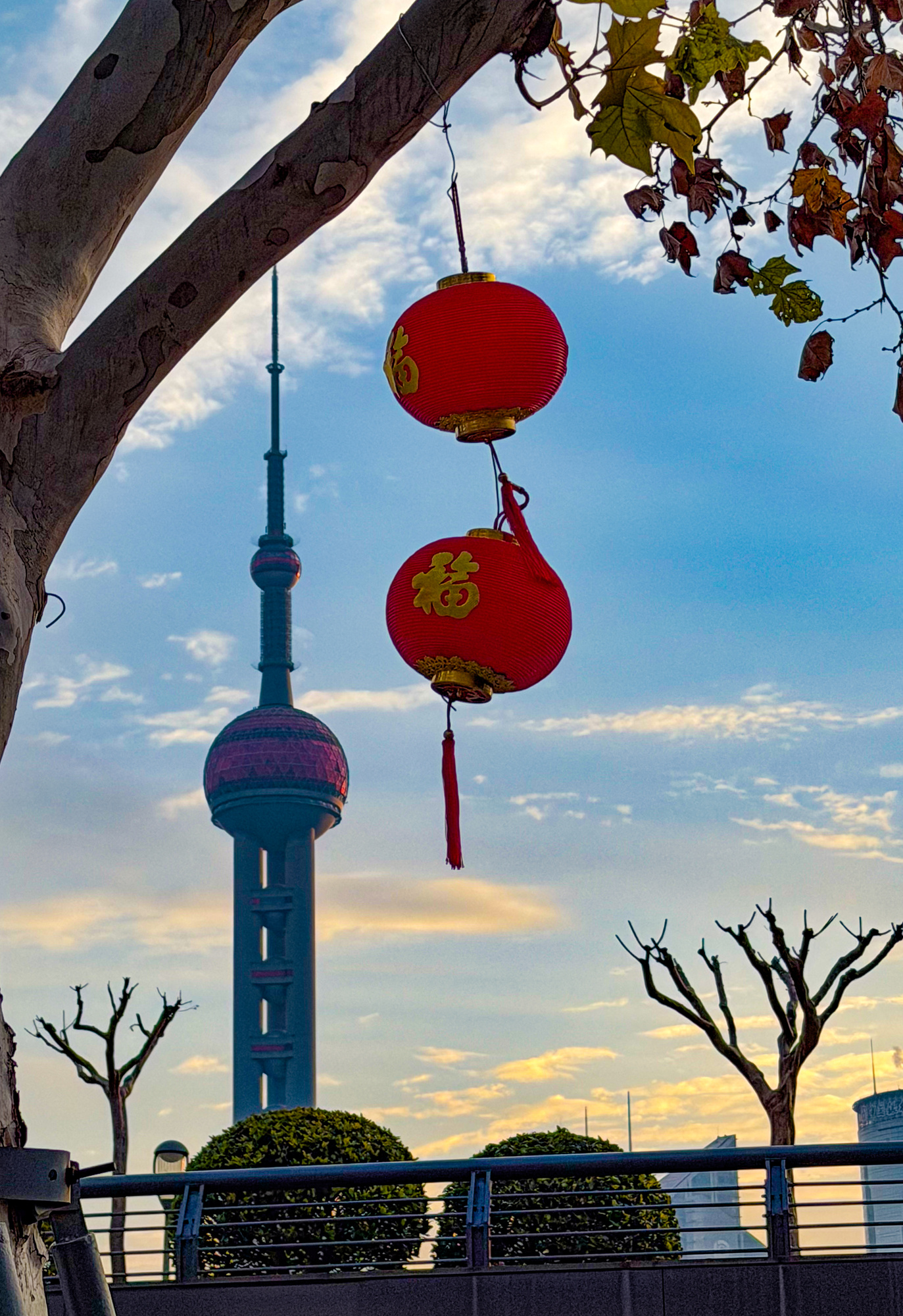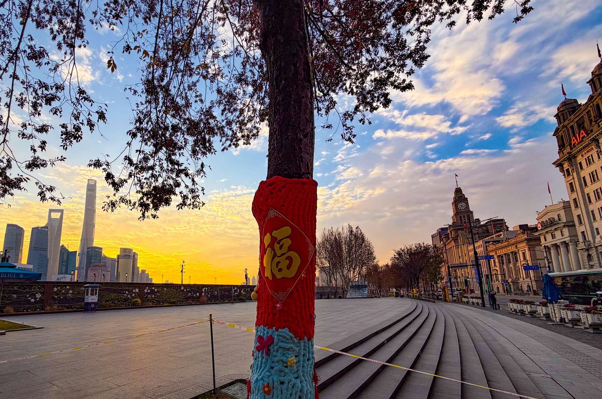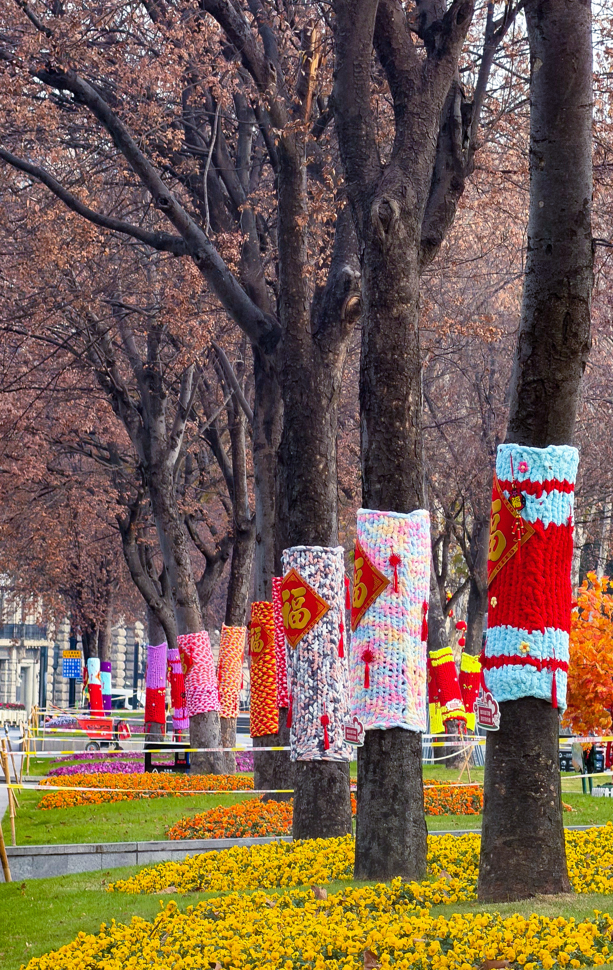 外滩沿线的部分树木被手工织成的彩色毛线织物包裹起来,花纹、福字、红灯笼,为这个冬日增添了一丝年节的温馨气氛。