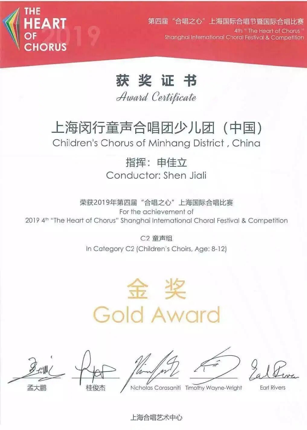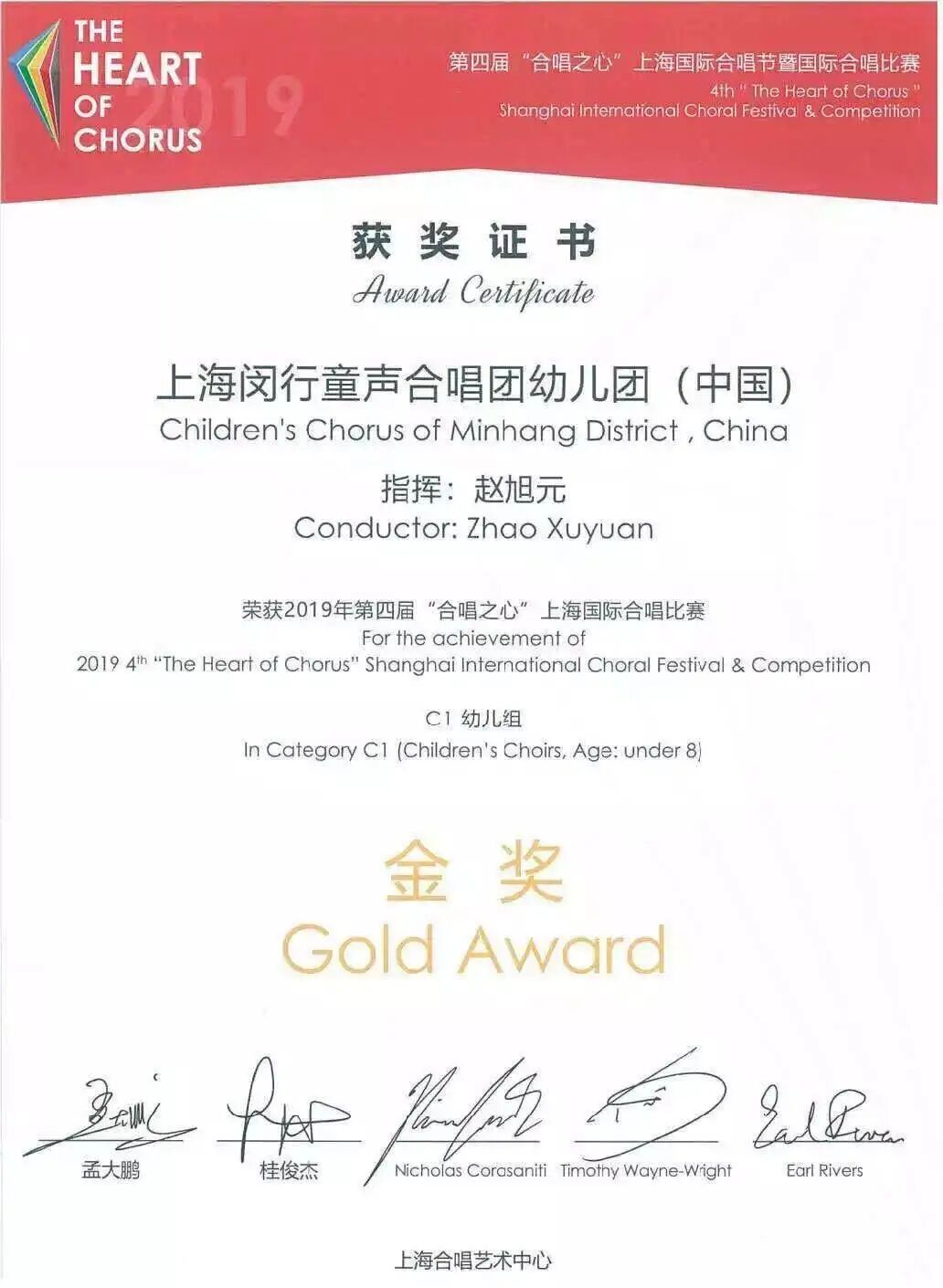 2019年5月第四届“合唱之心”国际合唱比赛中,“闵童”派出了两支队伍参赛,分别是5—8岁的幼儿团和8—12岁的少儿团,获得幼儿组金奖以及童声组金奖!