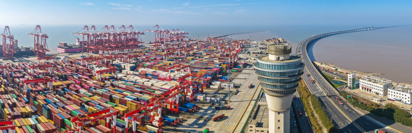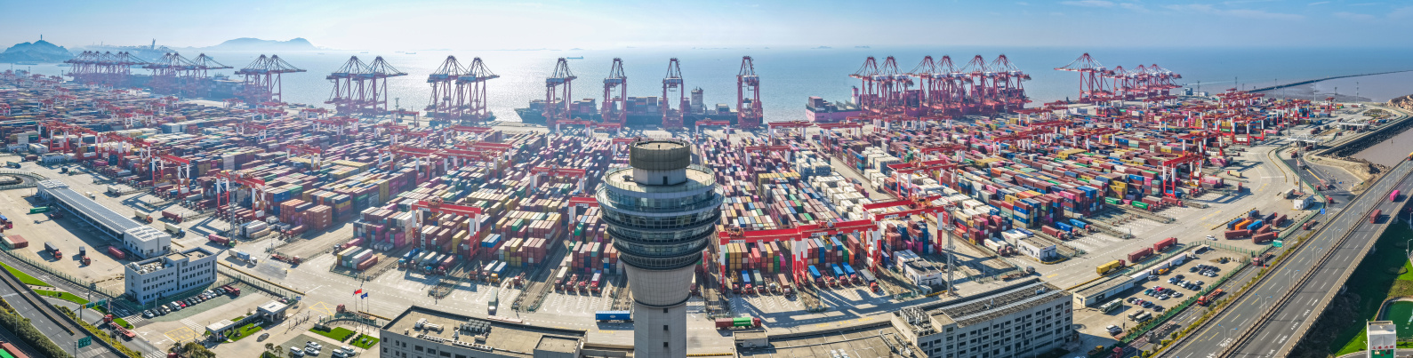 杭州湾口,茫茫东海之中,紧邻东海大桥的地方,无数集装箱整齐堆叠在洋山港四期码头的岸线上,巍为壮观。