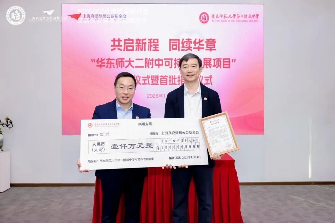 1 可持续发展项目正式启动 仪式上,“华东师大二附中可持续发展项目”正式启动。秘书长戴伟佳介绍:“该项目主要从五大方向支持学校发展,一是建设高水平科创实验室,重点覆盖物理、化学、生物、信息科学等竞赛学科与前沿学科;二是设立‘仲磐奖学金’,以首任校长之名激励学子追求卓越;三是设立奖教金,奖励优秀教师并支持人才引进;四是支持学生社团与美育发展;五是为学校其他长远规划提供灵活支持。” 为确保项目规范运行,项目设立了管委会,由校方、校友会、捐赠人代表及真爱梦想基金会共同组成,所有捐款由基金会统一接收并定期公示,全程接受审计与监督,实现“管理透明,共同监督”,真正实现可持续发展。 2 捐赠超千万 多位校友真情回馈母校 活动上,多位校友以实际行动表达对母校的感谢与支持。1986届校友、校友会金融投资分会会长、光合创投基金创始人宓群领捐1000万元支持“华东师大二附中可持续发展项目”,其中部分用于支持学校科创大楼中“信息学·建国实验室”的建设。他表示,此次捐赠既是感恩母校培养,也是回应人工智能时代的教育需求。据悉,该实验室以“建国”命名,旨在向二附中信息学教学开拓者蒋建国老师致敬。 学校还正式设立了“仲磐奖学金”,以此纪念首任校长毛仲磐先生,传递教育薪火。2022届校友程天纵代表外公毛嘉丰先生和母亲毛坚菁校友为“仲磐奖学金”首捐5万元。 3 母校与校友互相成就 以温暖铸就卓越教育 周彬在致辞中表示,“华东师大二附中可持续发展项目”的设立,是学校发展迈出的关键一步,具有里程碑式的重要意义。他强调:“一所优秀的学校,既要看到个人的茁壮成长,又要看到个人间的温暖相待,温暖不仅让学校变得更优秀,也让每一个二附中人感受到浓浓的归属感。二附中不仅要追求学业与竞赛的卓越,更要关注每一个学生是否学得开心、是否发挥特长、是否拥有面向未来的能力。我们真正要做的,是为国家和民族培养能引领未来的人。” 校党委书记袁军在总结讲话中指出:“该项目不仅是资源的汇聚,更是爱心与精神的传承。学校承诺将严谨、透明地使用每一笔捐赠,定期向社会公布进展,接受监督,让信任成为项目运行的基石,也希望广大校友持续关注母校,携手推动二附中在新时代走向更高远的发展之路。” 未来,二附中将继续以温暖为底色,以卓越为目标,承载梦想,照亮前程,在新时代的教育征程中书写更加辉煌的篇章。