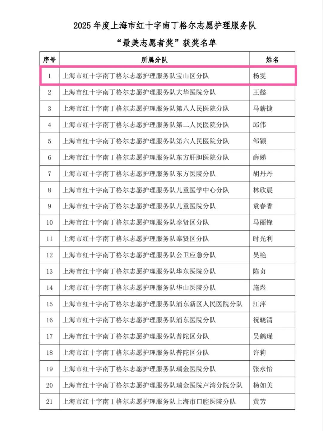 经综合评审,上海市红十字南丁格尔志愿服务队宝山区分队获评2025年度“活力团队”称号,吴淞中心医院杨雯同志获评“最美志愿者”。