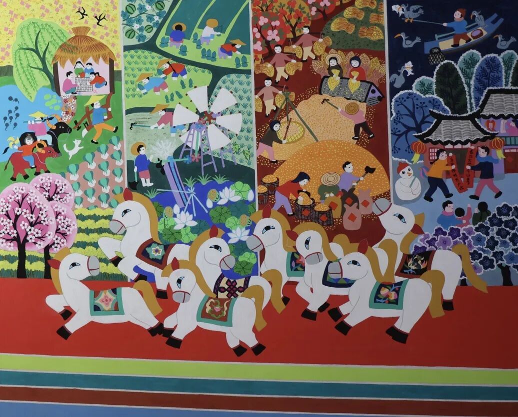 同样以马为主题,陈惠方的《八骏循时图》则暗藏巧思,以“四季入画、八骏牵年”的构思,将马年意趣与江南农耕烟火完美融合。