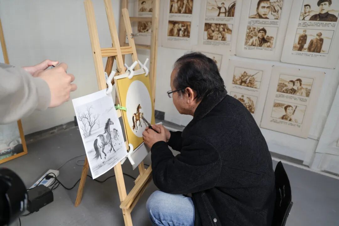 1月14日上午,记者来到焦永兴的工作室,只见他正手持电烙铁专注创作骏马图。