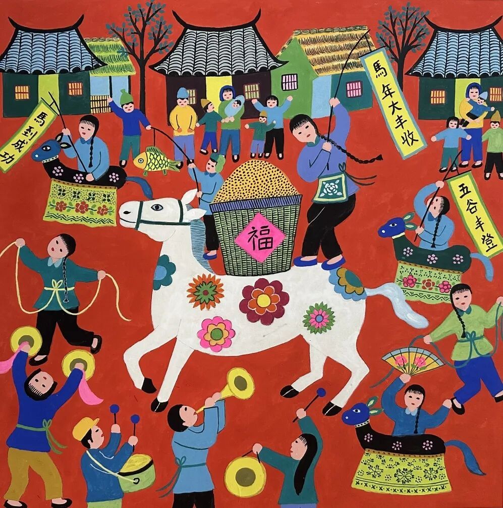 陈卫雄创作的《马年兴旺》,用浓烈的乡土色彩与鲜活的民俗场景,提前渲染出新春的喜庆氛围。红底之上,一匹饰满繁花的白马驮着写有“福”字的谷仓,饱满的金黄稻粒象征着丰收的喜悦;画中十余位村民或敲锣打鼓、或高举“马年大丰收”“五谷丰登”的旗帜,热闹的串马灯民俗活动穿插其间,一派欢腾祥和的景象。