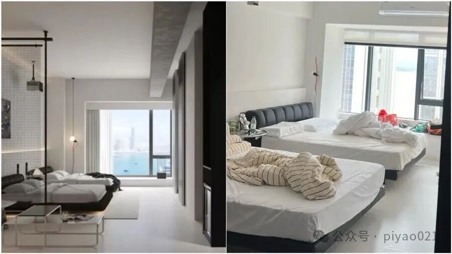 左图为房东发布在线上预订平台的房间图,右图为入住时拍摄的实景图