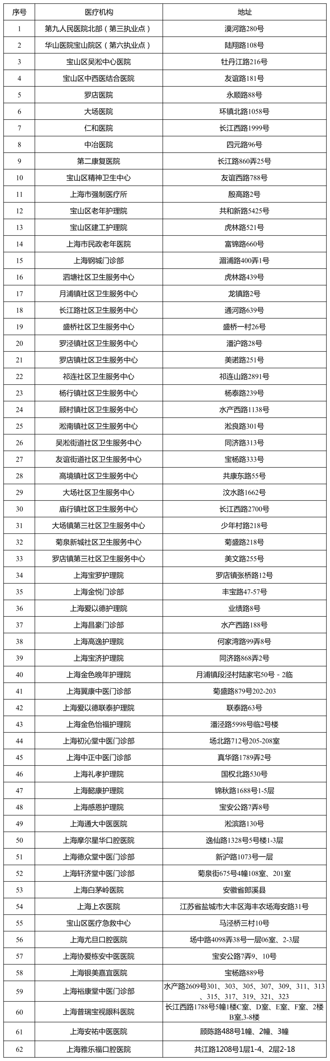 截至2026年1月14日,宝山区域内定点医疗机构数达62家,具体信息如下:
