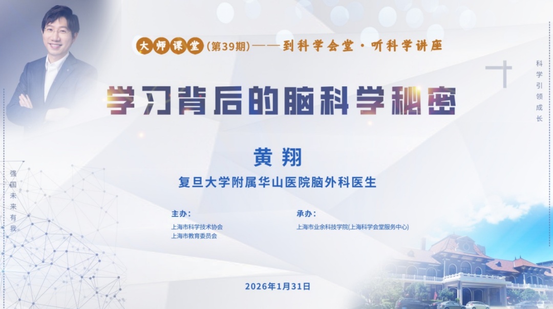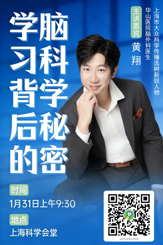 这次,黄翔博士将在上海科学会堂与大家分享“学霸脑”的修炼秘诀,以通俗易懂的语言为我们揭示学习背后的脑科学秘密,从大脑的角度优化学生运动、营养、睡眠,提升记忆力和专注力,培养健康用脑、科学学习的习惯。