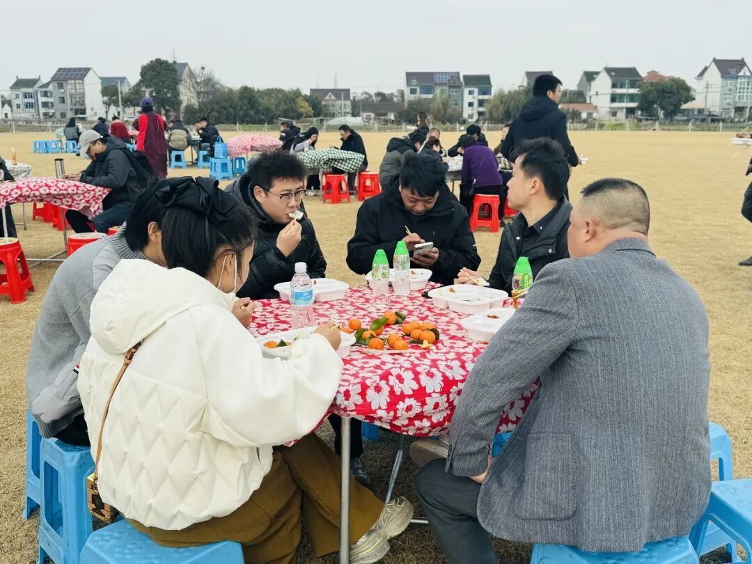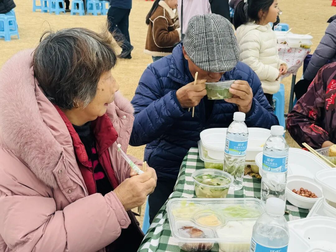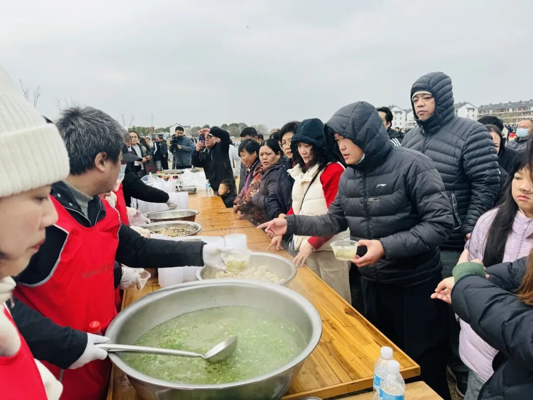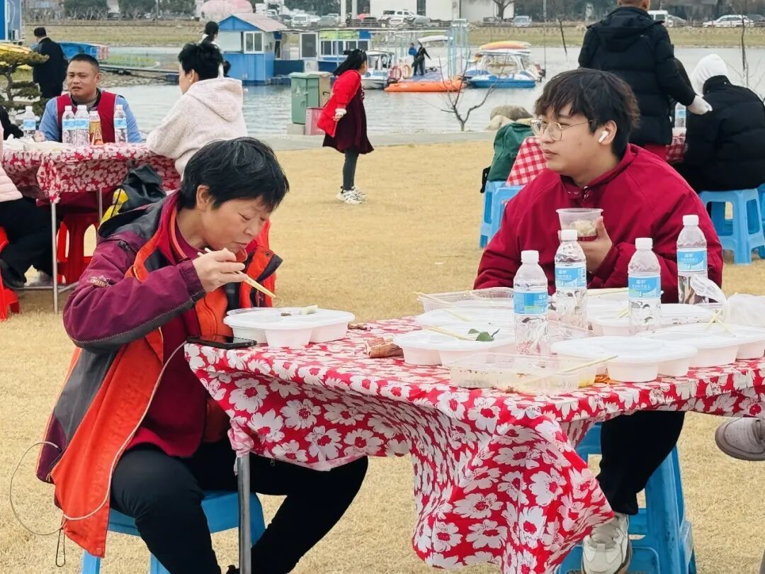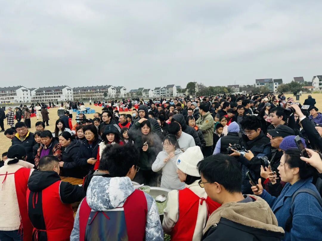 现场,在志愿者们的引导下,近千名网友秩序井然,围坐在一起。来自贵州的骑友鲍女士告诉记者,今年是她骑游中国的第三年,刷到“喝羊汤”的短视频后,自己刚好骑行到上海地界,就立马加入了粉丝群报名参与,现场热闹氛围让她欢喜不已。“作为一个贵州人,我太喜欢金山的氛围了,骑行一路的风景特别美,人们都很热情,年味太浓啦!”