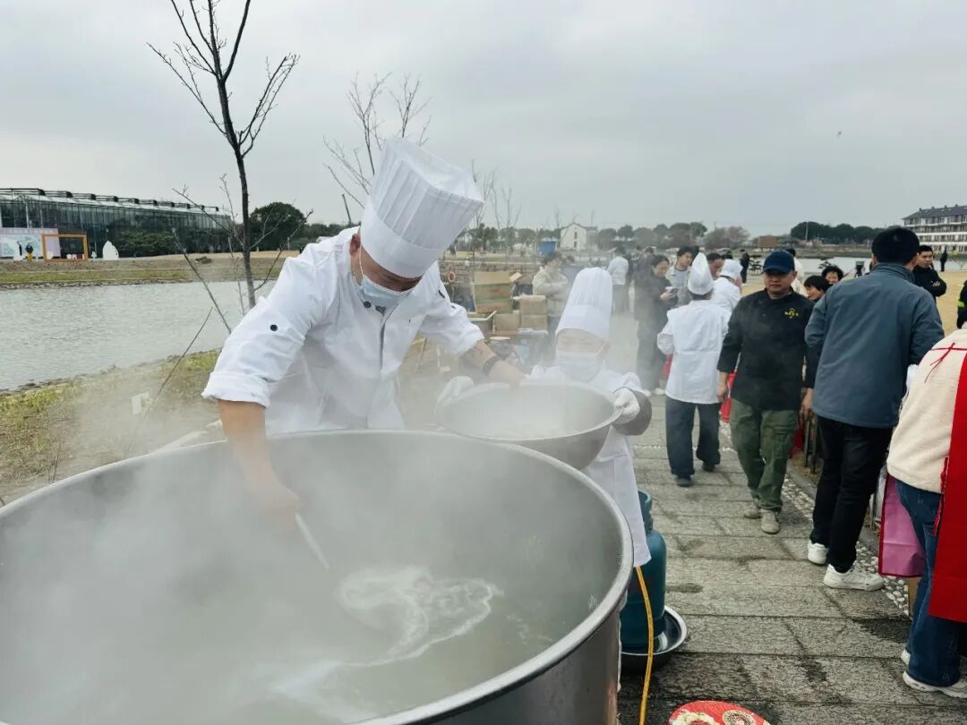 1月18日上午十点,吕巷水果公园内人头攒动,湖心岛上,66张四方桌间隔排开,来自贵州、陕西、北京等五湖四海的网友们陆续抵达。不一会儿,热气腾腾的羊汤正式出锅。奶香十足的羊杂羊肉,浇上滚烫澄亮的羊汤,再撒入青绿色的香菜、蒜叶等,一碗碗暖胃又鲜美的汤品便递到了人们手中,欢声笑语中,冬日寒意悄然消散。