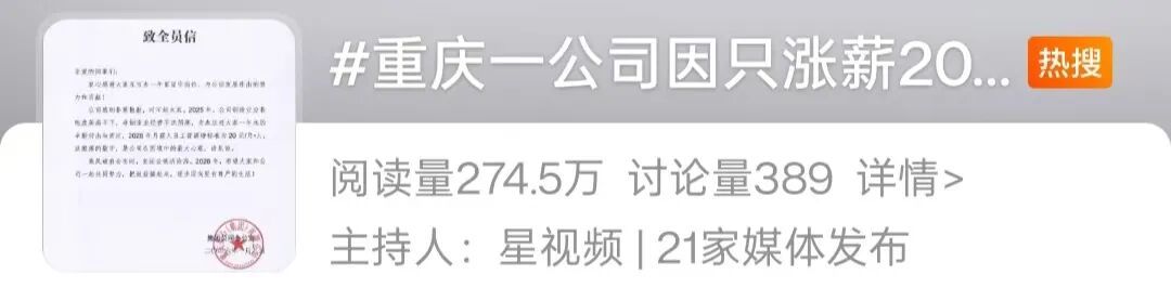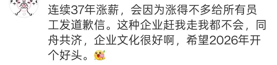 他还表示,2023年公司曾因只涨50元月薪,也发过致歉信。2025年公司经营压力大,在反复讨论后,仍决定延续传统,“哪怕只加20元,也是向员工传递信心。”