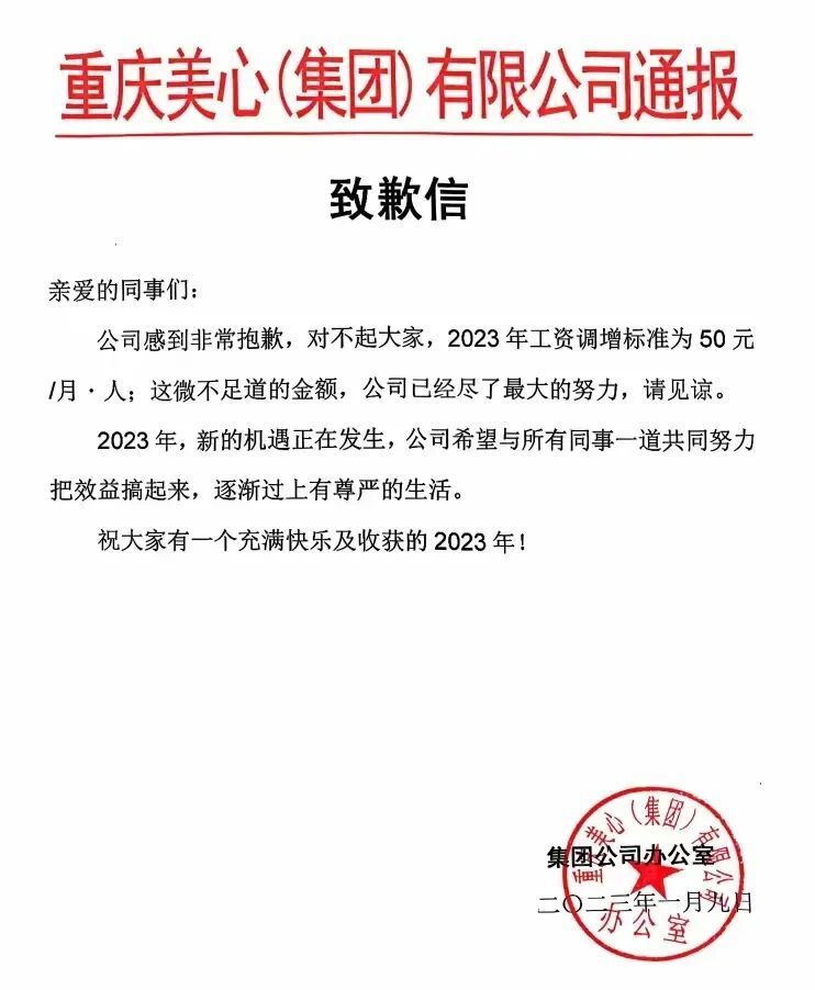 近日,重庆美心集团一份关于2026年度调薪的致歉信受到关注。信中称,今年公司决定为基层员工涨20元月薪,并对涨幅较低表达歉意,“非常抱歉,对不起大家”。