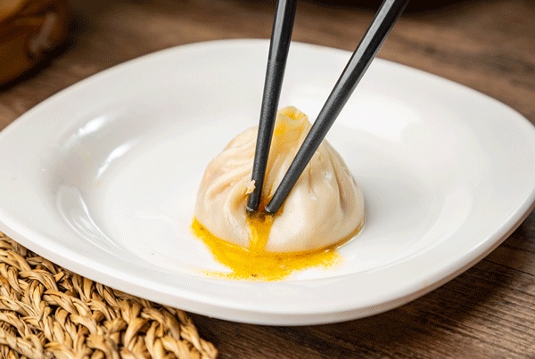 说起屋有鲜的小笼,32道褶子是刻在骨子里的标准。透明厨房里,师傅们的手法行云流水,捏褶、收口一气呵成,每一道褶子都均匀利落,既保证了颜值,更牢牢锁住内里的鲜醇汤汁。面皮更是暗藏玄机,加入鸭蛋黄调制的面皮,薄如蝉翼却韧劲十足,夹起时透光不破,翻身时不漏一滴汤汁。入口带着淡淡的麦香与微甜,完全不会抢了蟹鲜的风头,反而像温柔的底色,衬托得蟹味愈发突出。
