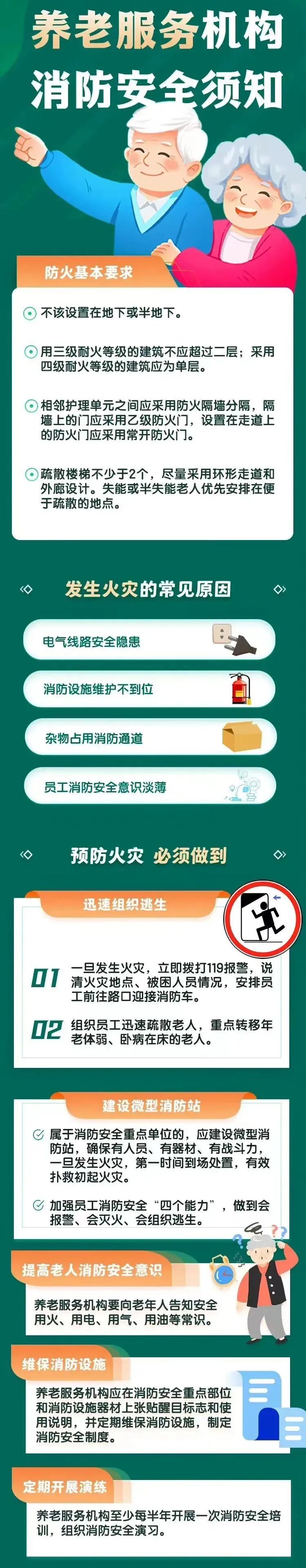 养老机构属于人员密集场所,且入住的对象大部分为行动不便的老年人,火灾时疏散逃生困难。一旦发生火灾事故,极易造成严重的人员伤亡和财产损失。养老机构要提高自身消防安全水平,保障老人幸福安全晚年生活。这份养老机构消防安全提示,请牢记。