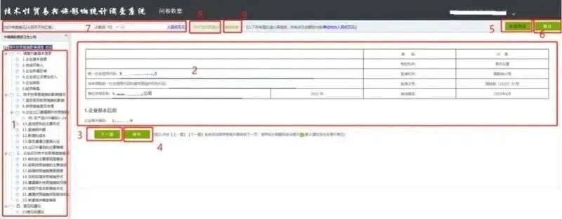 ①问卷目录区:显示问卷的目录结构,点击题目可直接进入该题目。左侧的题目前显示绿色代表本题答完。
