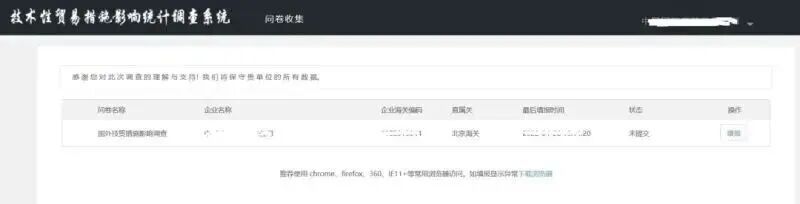 登录成功后,可点击【填报】,直接进入填写主页面,企业在海关未核对前均可再次修改问卷内容。