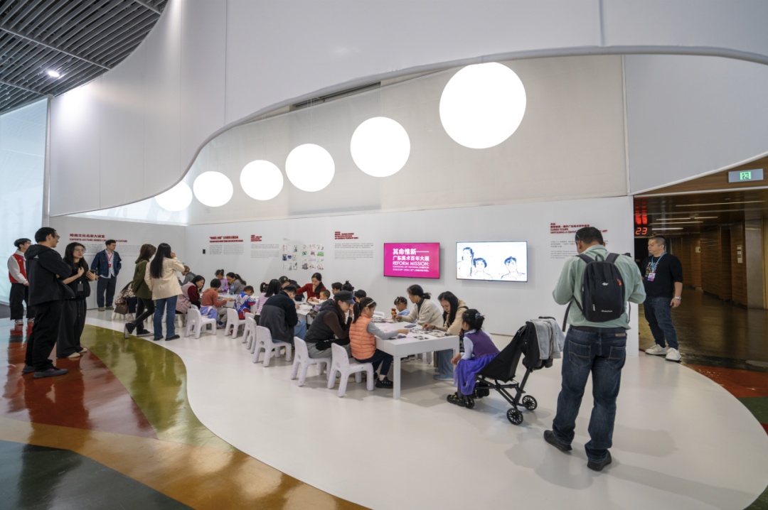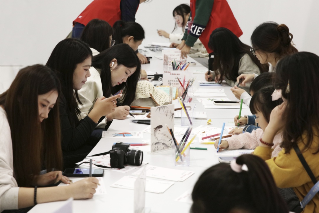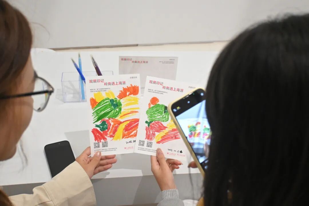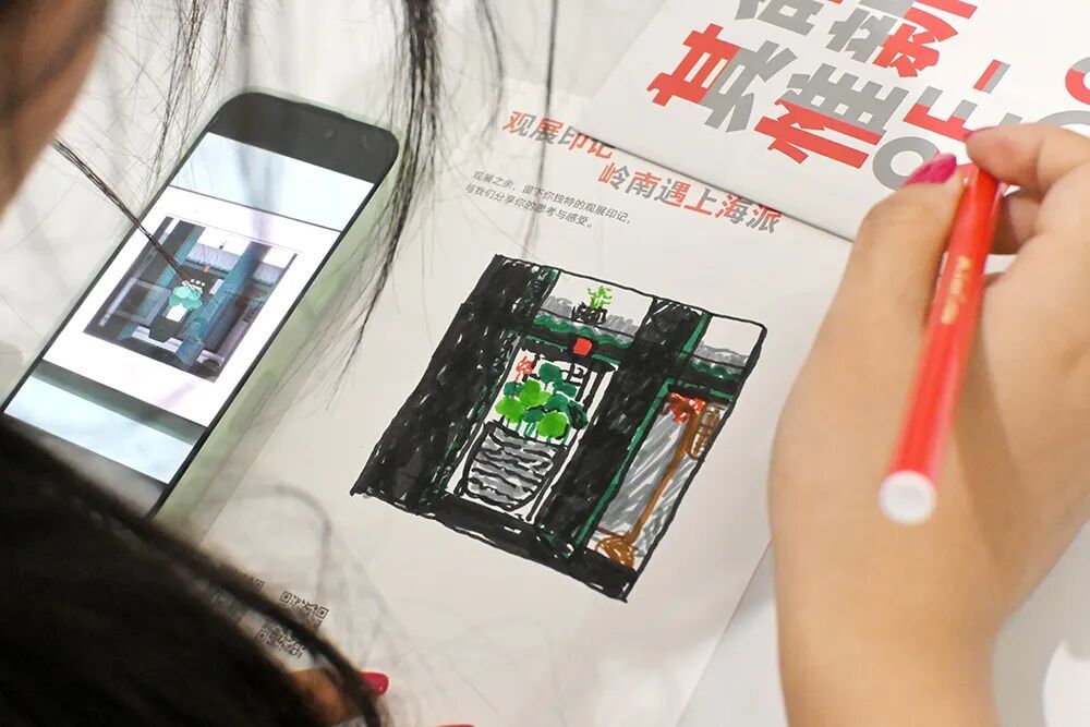 观众在“岭南遇上海派”公共教育互动空间参与创作活动。
