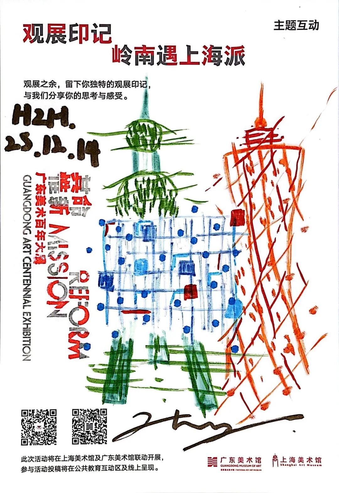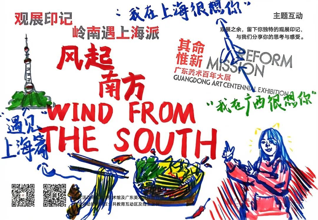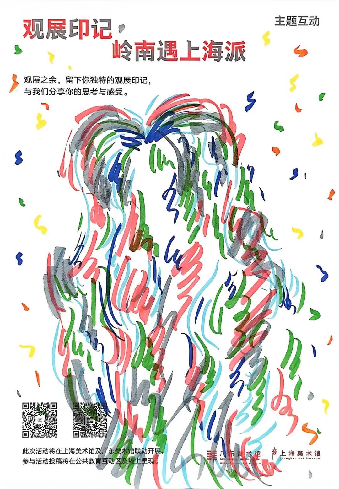 在上海美术馆场馆内设置的公共教育互动区,成为不同年龄段的艺术爱好者交流互动、参与艺术游戏的平台。近百场导览活动,由展览总策划、沪上知名学者、公共教育专员和志愿者主讲,从不同角度讲述广东美术百年故事。不同主题的美育活动,引导观众在鉴赏与创作中感受“南风沪韵”,深度体验艺术的魅力与创作的乐趣。“Artwalk 海派与岭南文化之旅”“艺术脱口秀”等沪上特色项目,以接地气的方式建立了上海观众与广东美术的链接。两馆携手开展的馆校合作项目深度开发大展资源,上海美术馆的“美术馆现场教学课”将师生带进场馆与原作面对面,广东美术馆的“艺术进校园”系列则将展览资源“打包”送入学校,建立两地师生的情感链接,探索艺术资源融入学校教育教学的多维方式。大力发展文化志愿服务,以专业、热情的美术馆志愿服务助力教育活动的顺利开展。