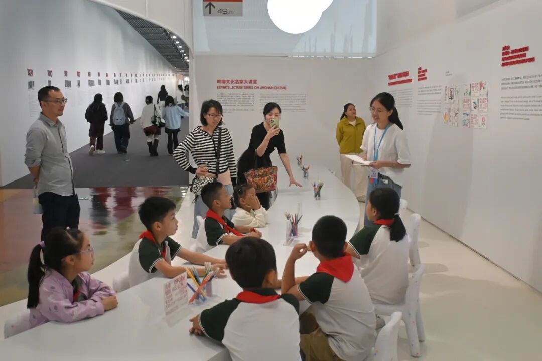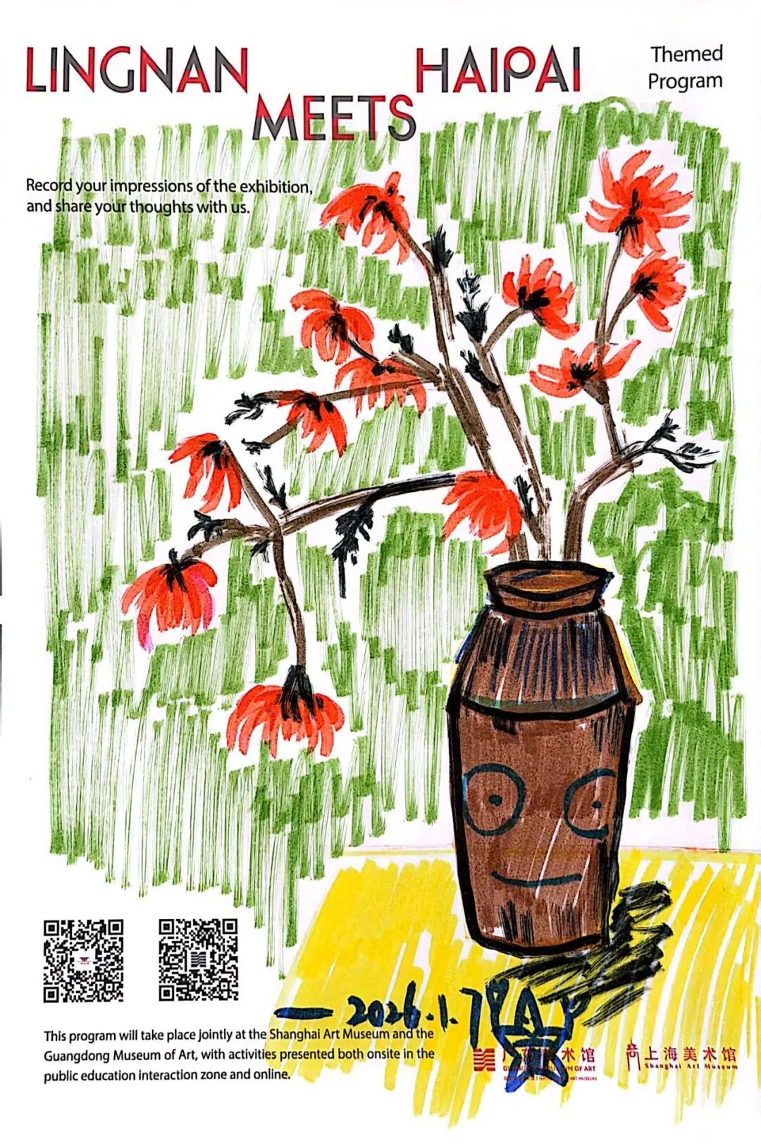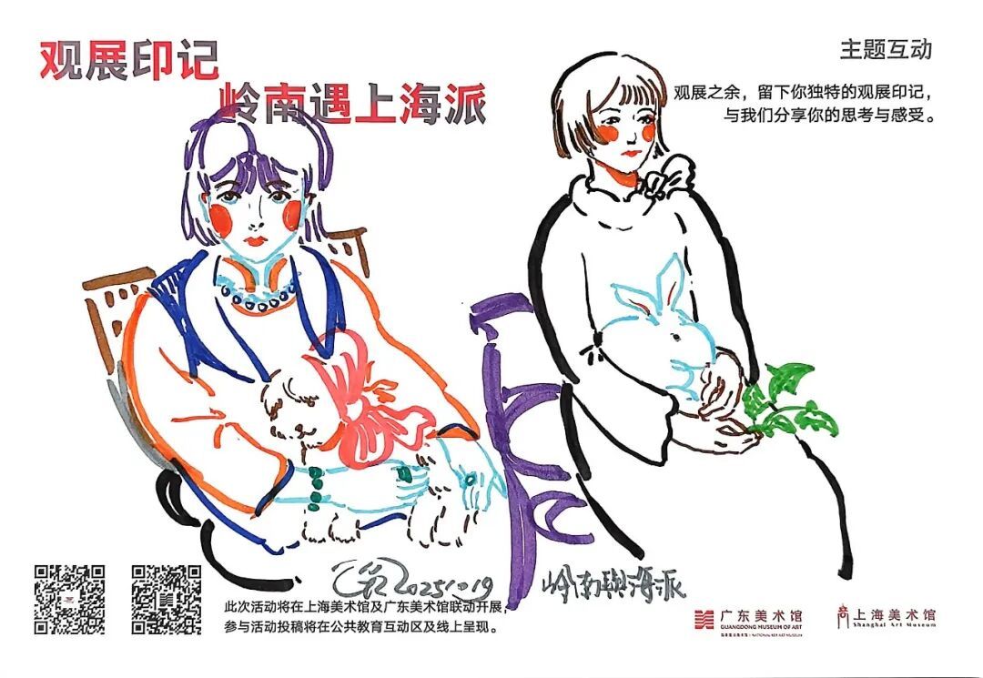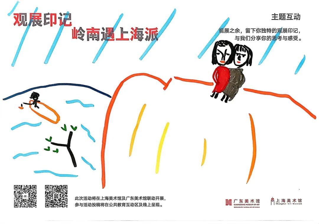 在上海美术馆场馆内设置的公共教育互动区,成为不同年龄段的艺术爱好者交流互动、参与艺术游戏的平台。近百场导览活动,由展览总策划、沪上知名学者、公共教育专员和志愿者主讲,从不同角度讲述广东美术百年故事。不同主题的美育活动,引导观众在鉴赏与创作中感受“南风沪韵”,深度体验艺术的魅力与创作的乐趣。“Artwalk 海派与岭南文化之旅”“艺术脱口秀”等沪上特色项目,以接地气的方式建立了上海观众与广东美术的链接。两馆携手开展的馆校合作项目深度开发大展资源,上海美术馆的“美术馆现场教学课”将师生带进场馆与原作面对面,广东美术馆的“艺术进校园”系列则将展览资源“打包”送入学校,建立两地师生的情感链接,探索艺术资源融入学校教育教学的多维方式。大力发展文化志愿服务,以专业、热情的美术馆志愿服务助力教育活动的顺利开展。