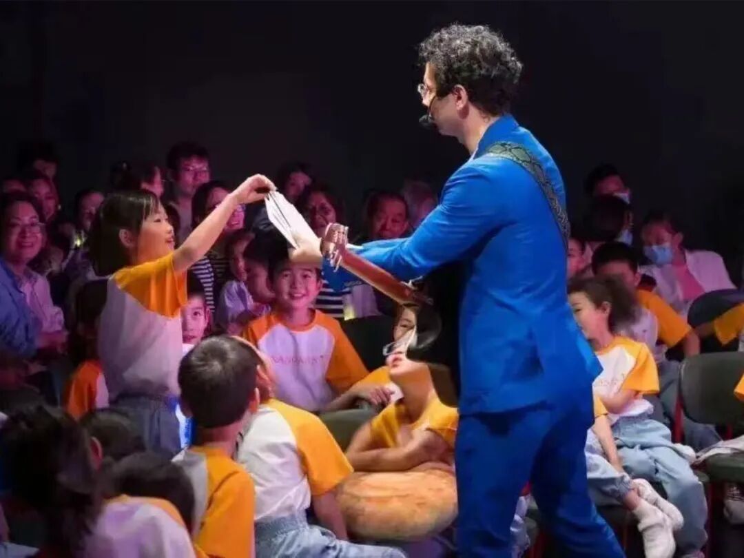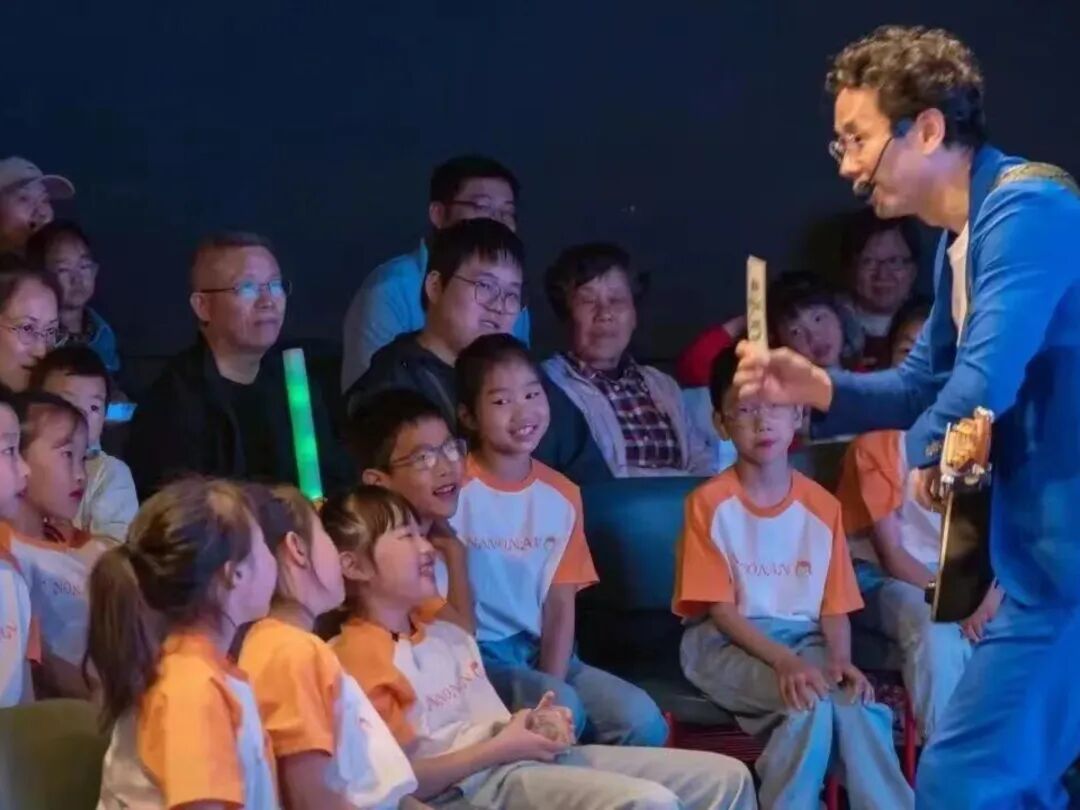 在去年的10月,《侬好·囡囡》音乐会就曾来到过海上梨园,活动现场王渊超老师带着吉他,与孩子们用软糯沪语唱起《Me More Say》,甜丝丝的调子会让观众们不由自主地轻拍掌心,眼角满是笑意。