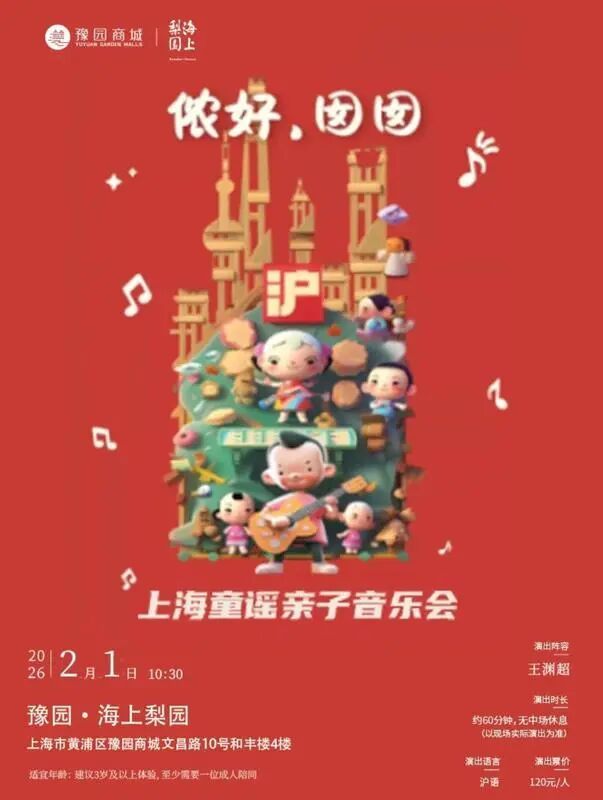2月1日,“上海童谣第一人”王渊超将在豫园新国风剧场“海上梨园”举行上海童谣亲子音乐会《侬好·囡囡》。