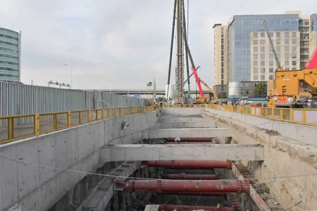 丹桂路站2B出入口基坑深12.75米、长64.5米、宽4.7米至7.9米,开挖中采用上方1道砼支撑、下方2道钢支撑支护。 高科中路站1号出入口为独立式出入口,采用顶管与车站站厅层相接,顶管通道宽6.9米、高4.2米、长39.3米,顶覆土厚约4.2米至5.2米,顶管机从附属结构1号出入口始发后以2.73%上坡度顶推至车站主体。