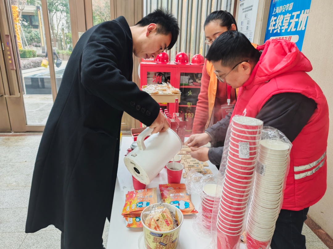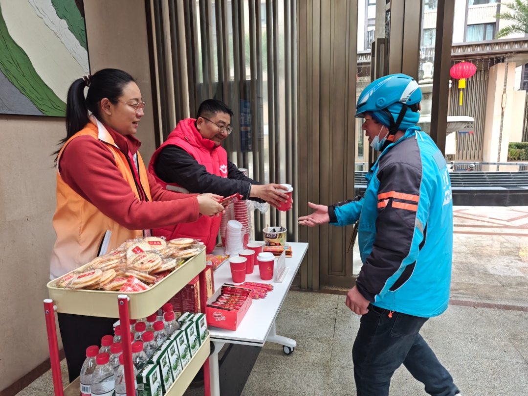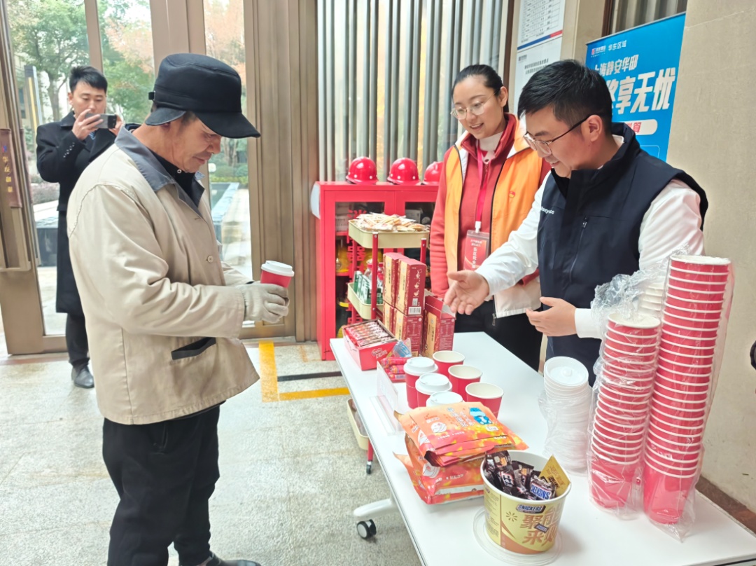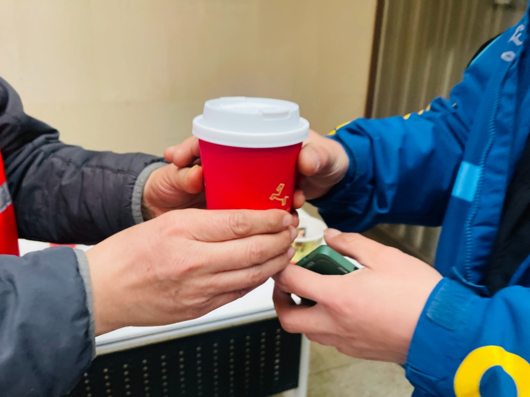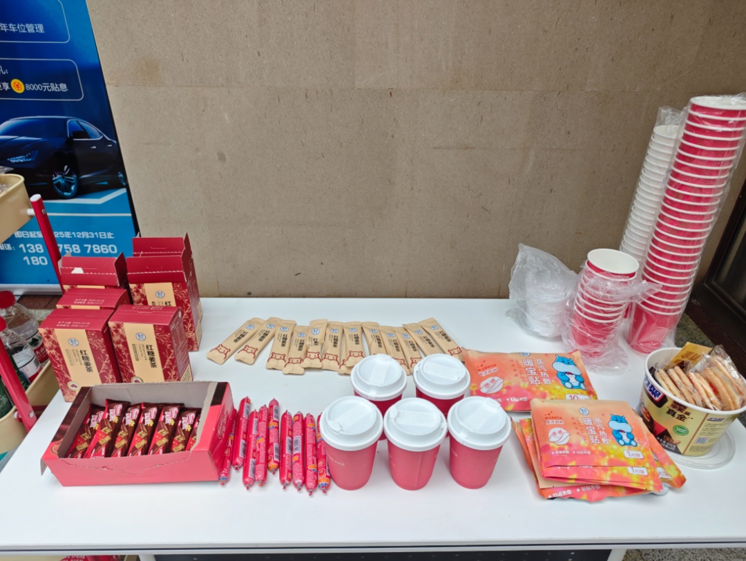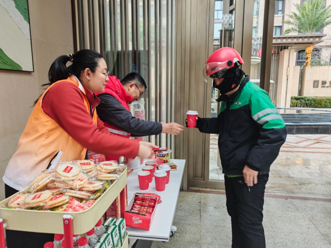 补给到位后,补给站旁的公益摊位即刻“上线”。物业人员提前备好充足热水,确保姜茶持续温热;街区党支部和社区的党员志愿者主动值守,见到过往的户外劳动者,便快步迎上前,递上热气腾腾的姜茶,送上暖宝宝、巧克力等物资,一句句“天冷路滑,辛苦了”的朴实问候,在寒风中传递着浓浓的暖意。