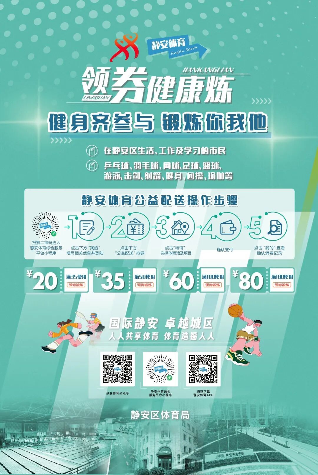 消费券领取方式为“静安体育综合服务平台”小程序每日定点发放,每人每周最多领取5张,有效期14天,若成功领券但没有使用,过期自动失效。体育消费券设置20元、35元、60元、80元等面值的通用体育消费券,在定点场馆健身消费时可直接抵扣。
