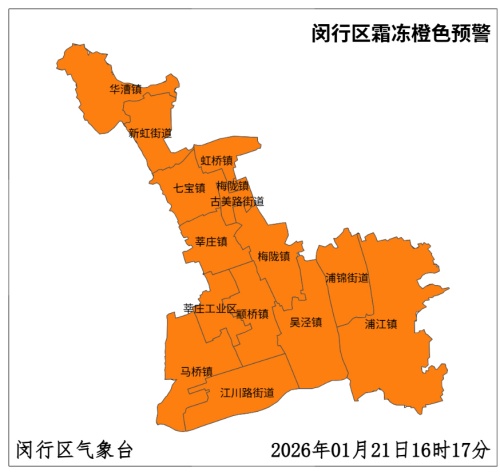 闵行区气象台2026年1月21日16时17分发布霜冻橙色预警信号: