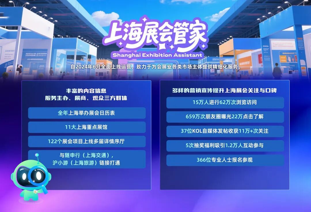 “上海展会管家”小程序上线122个5万平方米以上展会项目,直观展示11大展馆展会日历与办展政策,累计获15万人、62万次访问,为展客商提供“一站式”智能服务。我委提级保障“上海车展”、Bilibili World、CP2025SP等重点展会。本届车展展出总面积36.8万平方米,展出整车1366辆,累计接待观众101万人次;本届Bilibili World展览面积增长46%。