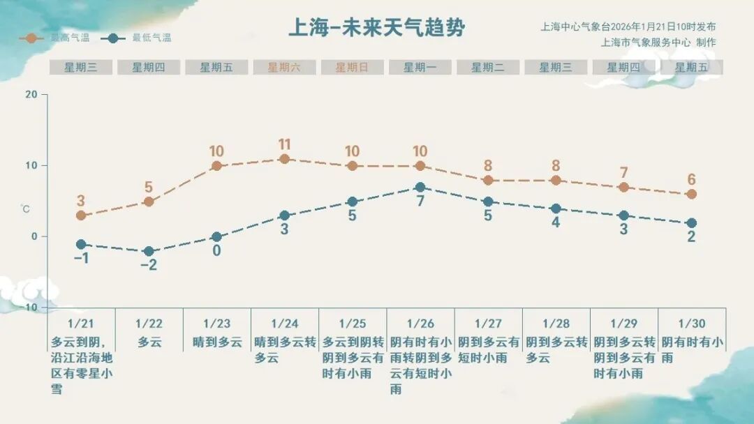 “明天早晨受辐射降温影响,气温仍较低,市区最低气温为-2~-1℃,郊区则为-6~-3℃。”上海中心气象台预报员杜予罡告诉记者,“明天以多云天气为主,最高气温在5℃左右,23日起气温开始回升,以晴到多云天气为主。受短波槽影响,26日起本市多弱降水过程。”