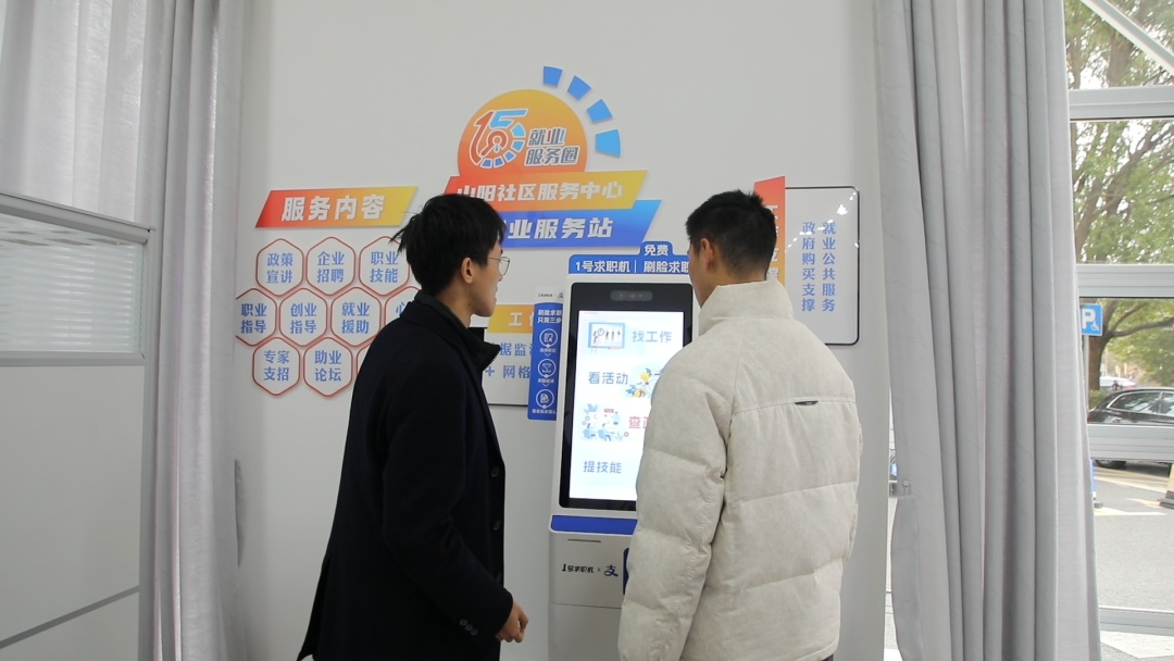 1月19日下午,在亭卫公路1500号的宜业山阳·社区就业服务站内,工作人员正在指导求职者黄恺在“1号求职机”前操作。完成刷脸后,机器仅用几秒便读取了他的个人信息,求职者无需再手动填写繁琐资料。