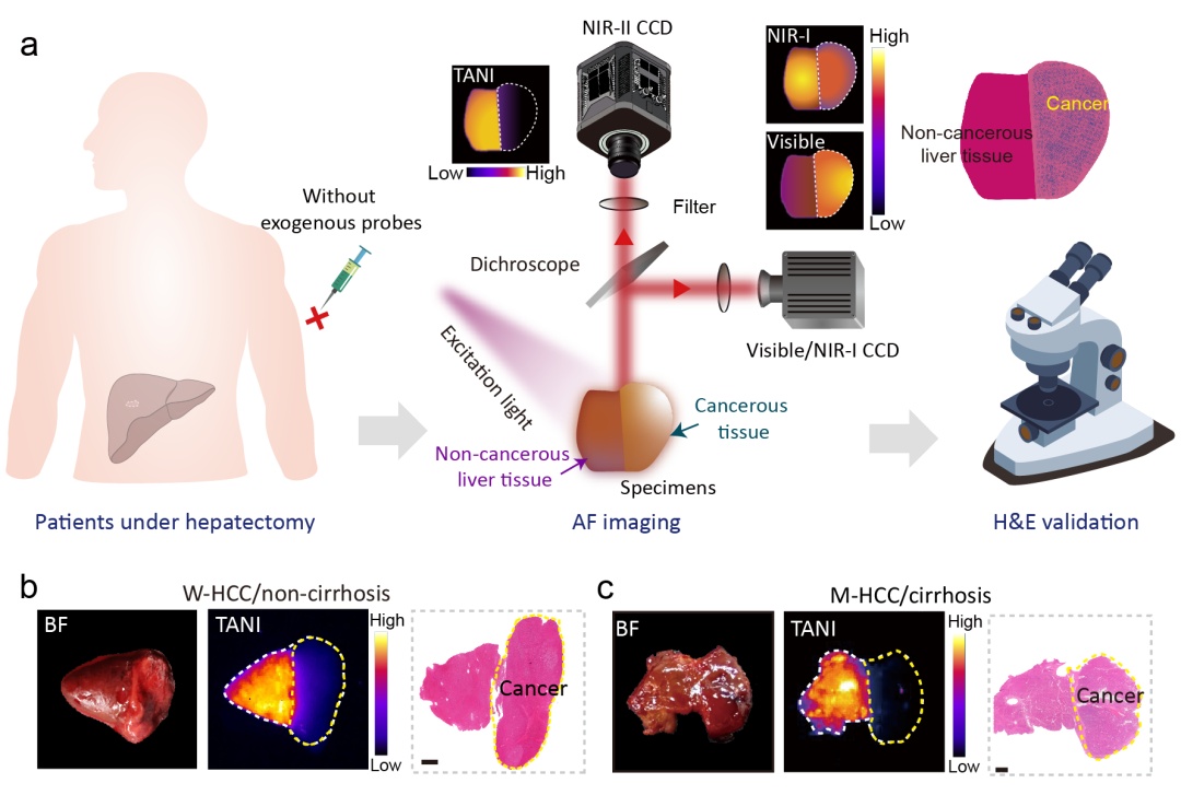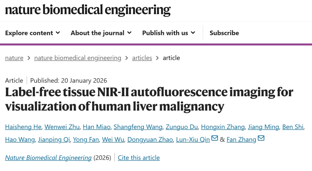 1月20日,相关研究成果以《无标记组织近红外二区自发荧光成像技术用于人肝恶性肿瘤可视化》(Label-free tissue NIR-II autofluorescence imaging for visualization of human liver malignancy)为题,在线发表于《自然·生物医学工程》(Nature Biomedical Engineering,影响因子26.6)。