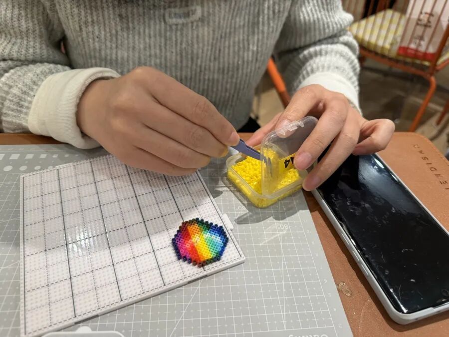 一整个下午,拼豆店大部分时候都像自习室,玩家们各自拿着镊子、面对着豆板,只闻频繁响起的门铃声和偶尔几句闺蜜、情侣间的窃窃私语。