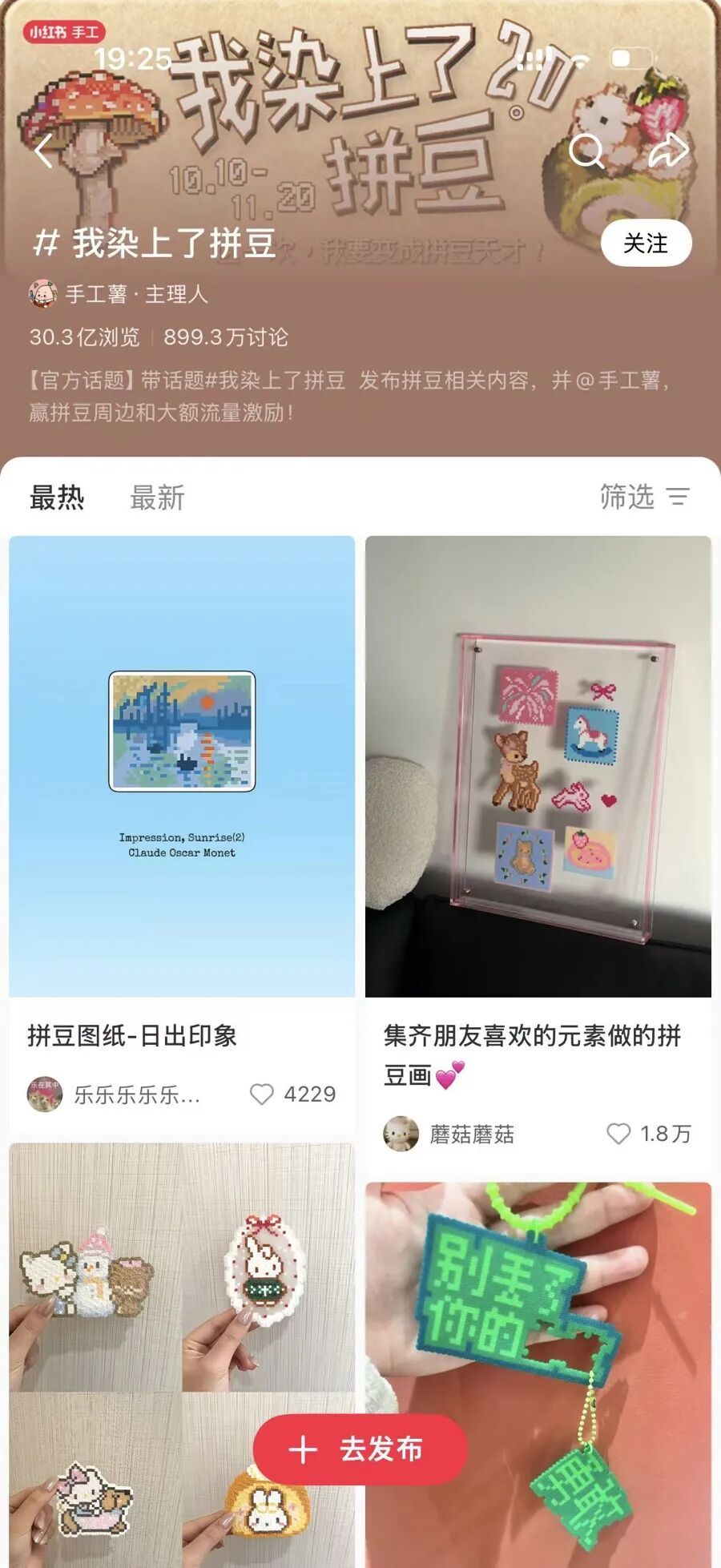 据淘宝官方数据,2025年十大商品中兼具高增长与情绪属性的品类表现突出,其中过去一年平台上“拼豆”搜索量同比上涨近500%。《小红书2025年度兴趣报告》也将拼豆列为十大出圈“奇怪”兴趣,其他还有谷子、手帐、手串、娃衣、钩织、BJD、胶片等。