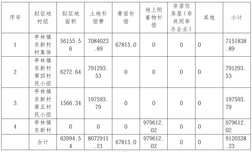 亭林镇东新村村集体,亭林镇东新村第四村民小组,亭林镇东新村第五村民小组(村组队);拟征收农用地25272.54平方米、建设用地38721.52平方米、未利用地0.48平方米,合计拟征地面积63994.54平方米。