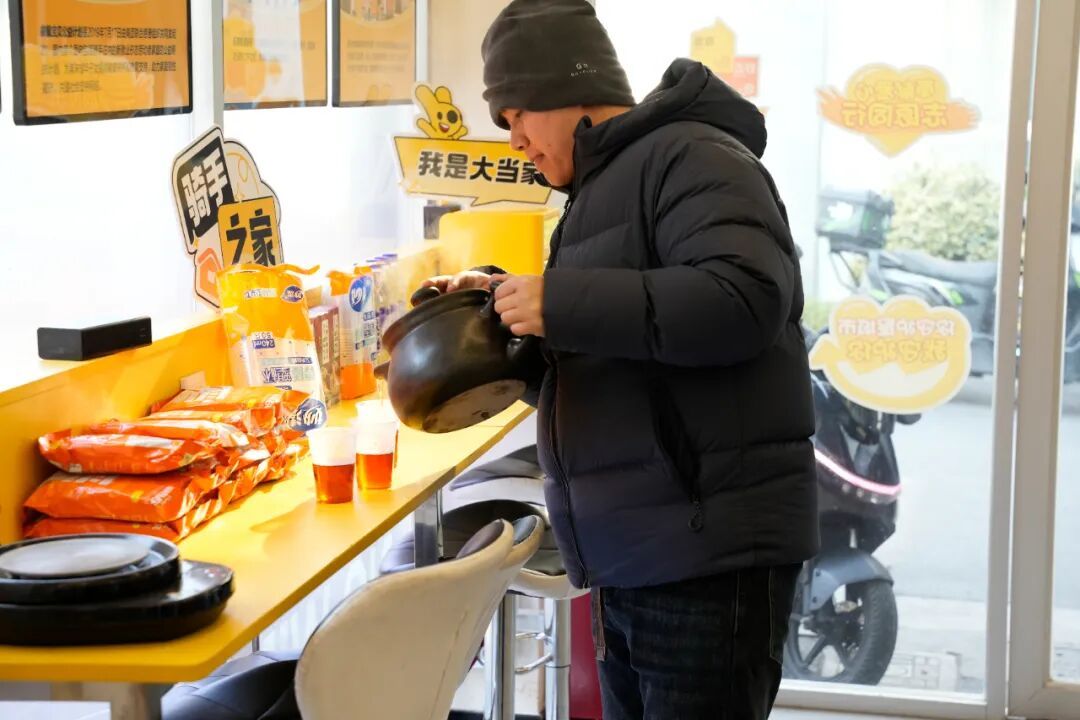 1月21日一早,室外寒风呼啸,骑手之家内却暖意融融。空调持续输送暖风,煮茶壶里温着的姜茶香气四溢,一旁的暖贴等物品供骑手随时取用。由于气温骤降,订单量提升,骑手韩俊杰天不亮就开始工作,几单跑下来手脚已冻得发麻,便趁等单间隙进来喝杯热茶、贴上暖宝宝,驱驱寒气。