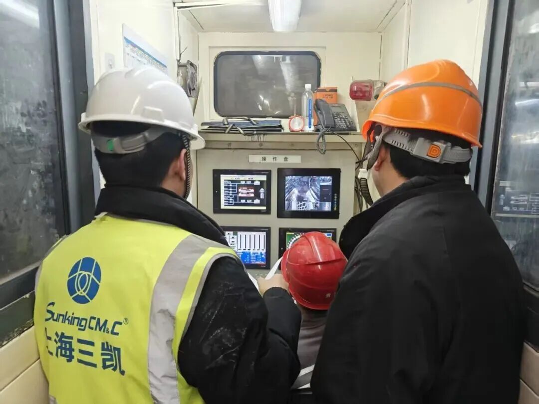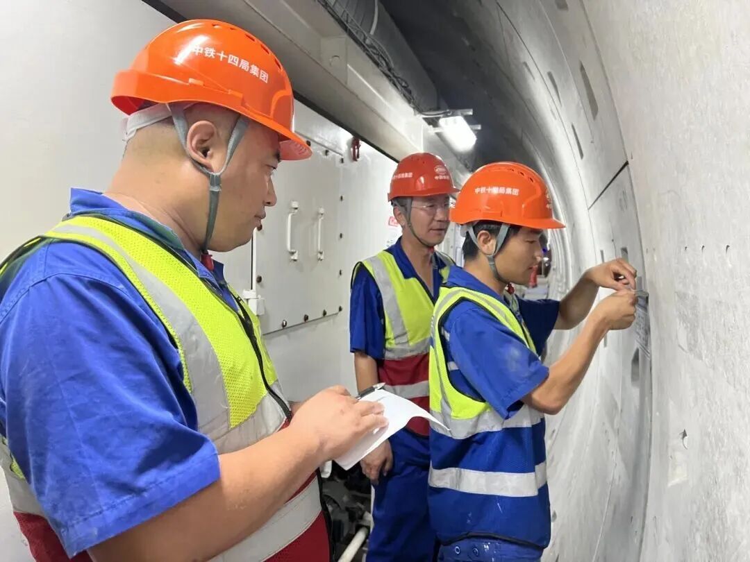 本次始发的23号线放鹤路站~吴泾北站盾构区间,全程采用预埋承插式管片施工技术。该技术借鉴中国古建筑榫卯结构的智慧,以凹凸结合的连接方式实现管片紧密拼插,相较于传统螺栓拼接工艺,不仅省去人工拧螺栓的繁琐工序,更在施工效率、结构稳定性和防水性能上实现质的飞跃,能有效提升成环精度,减少渗漏水隐患,同时增强隧道抗变形能力,大幅降低后期运维压力,是隧道工程绿色智能建造的重要实践。 面对冬季施工低温影响、地下管线复杂、地层条件多变等多重挑战,五分公司组建技术攻坚小组,精准谋划、科学部署。提前优化施工方案,反复推演盾构机组装、调试及掘进参数,对盾构机、龙门吊等大型设备进行全面巡检维保,更换耐低温配件、加装保温设施,保障机械运转稳定;同时加大地表沉降与隧道结构监测频次,建立“动态设计、信息化施工”机制,通过智能监测系统实时捕捉地质变化与设备运行数据,及时调整施工策略,筑牢安全质量防线。